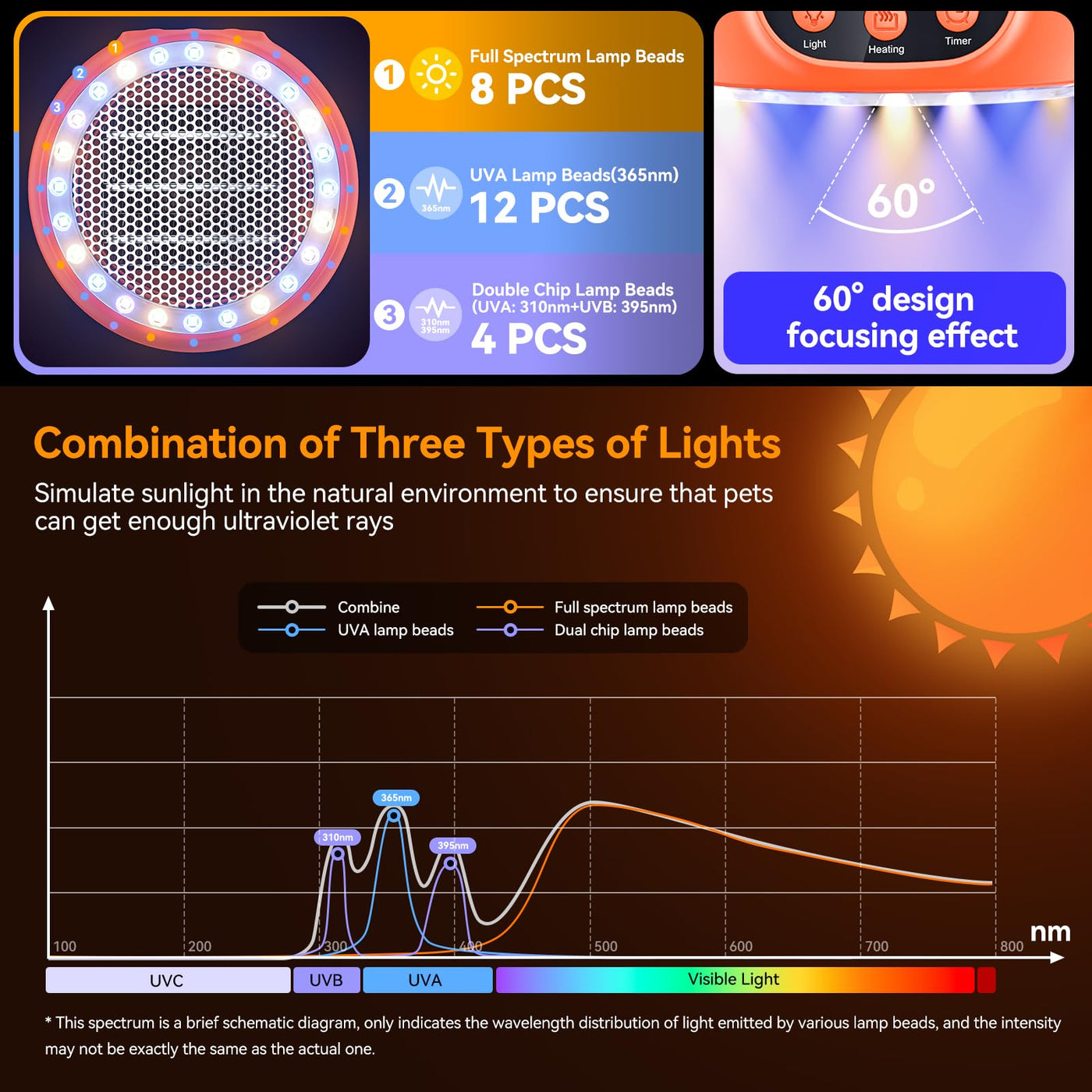 ???upgraded Chicken Coop Heater?:TFNN Chicken house heater lamp has 8 full-light bulbs 12 UVA bulbs (365nm) and 4 UVB bulbs (UVA: 310nm + UVB: 395nm). We will provide you with an additional UV test card. The brightness of the lamp can be adjusted in three levels: low medium and high. We will provide you with an additional UV test card. Providing the right amount of UVAUVB UV rays for reptiles dogs chickens chicks and other poultry can promote the absorption of calcium strong bones and healthy growth of pets.