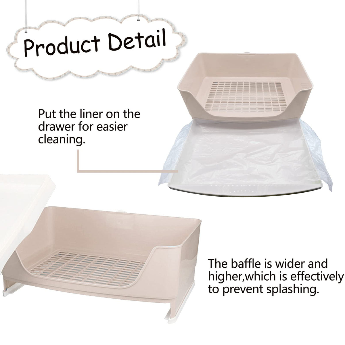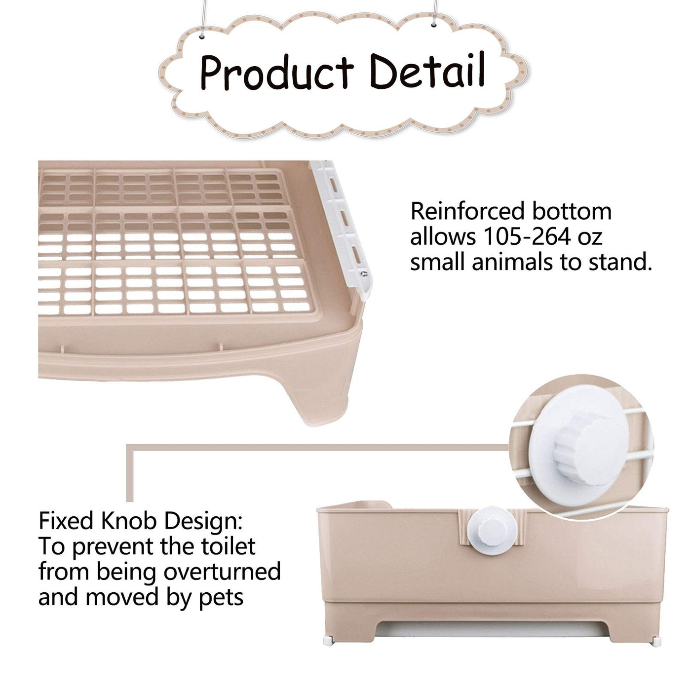 Q: What material is the litter box made of?A: The litter box is constructed from high-quality, durable, and odor-resistant PP plastic, ensuring it can withstand regular use by small animals weighing between 3 to 8 kg.