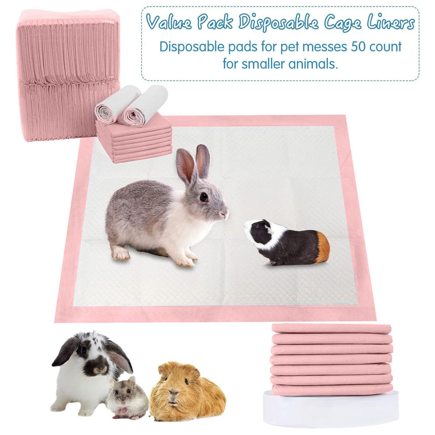 TfwadmxDISPOSABLE SMALL ANIMAL PEE PADS 50 PCSSPECIFICATIONMATERIAL: Cotton PECOLOR: PINKSIZE: 13 X 18 INCHES (33 X 45 CM)COUNT: 50DURABLE DISPOSABLE PET PADSSuper AbsorbentThicker absorbent layer for fast absorptionLeak-Proof MaterialLeak-proof PE cast film at the bottomMore DurableInduced ToiletingeSoft to the touch, making it easier for pets to learn to toiletWater-Locked EdgesDesigned with four absorbent surfaces to prevent side leakageEASY TO TAKEOur bunny pee pads can be used both indoors and outdoors. Flat floors, small animal boxes, dog crates etc. can all be handled with ease. The disposable cage liners are small and portable, so they are also handy in travel baskets or cat bag carriers.PAMPER YOUR LOVELY ONESAs well as providing a dry and comfortable solution for normal pets, our disposable pee pads are friendly to older and newborn animals as well as those that are still active. We hope that you and your pet will enjoy your life together by giving them more care and attention, changing the pet potty pads promptly and keeping your pet's place dry and odourless.