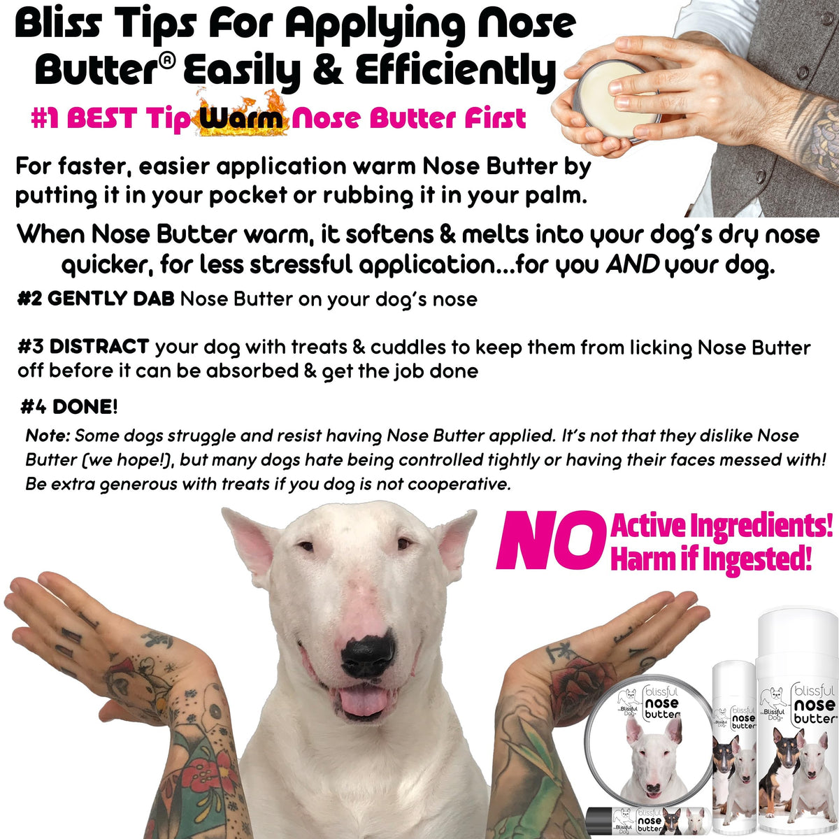Many dogs have a tendency toward a dry, crusty nose condition, frequently called nasal hyperkeratosis. While any dog can have this condition, some breeds have even more of a predisposition toward dry noses; French Bulldogs, Boxers, Pugs, Bulldogs, most Bully types, Mastiff breeds and their mixes. Nose Butter was developed specifically for this condition. Nose Butter moisturizes rough, dry crusty dog noses. All natural, rich moisturizers soften and smooth your dogs dry, crusty, cracked nose and works like a healing balm. Nose Butter is individually handcrafted in far northern Minnesota (yes, it is science fiction cold in the winter) using all natural and organic good stuff: shea butter, olive oil, castor oil, avocado oil, almond oil, coconut oil, beeswax and cocoa seed butter. Available in Unscented and Lightly Scented with Cedarwood, Cypress and Ylang Ylang. NOSE BUTTER USAGE: DAB a bit onto your dogs nose 1-3x a day for 2-3 days (until nose improves) and then as needed for maintenance (usually1-2x a week). DISTRACT with a treat (keeps them from licking NOSE BUTTER off while it moisturizes). DONE! Complete directions, tips, hints and dog nose info is available on product details pages.