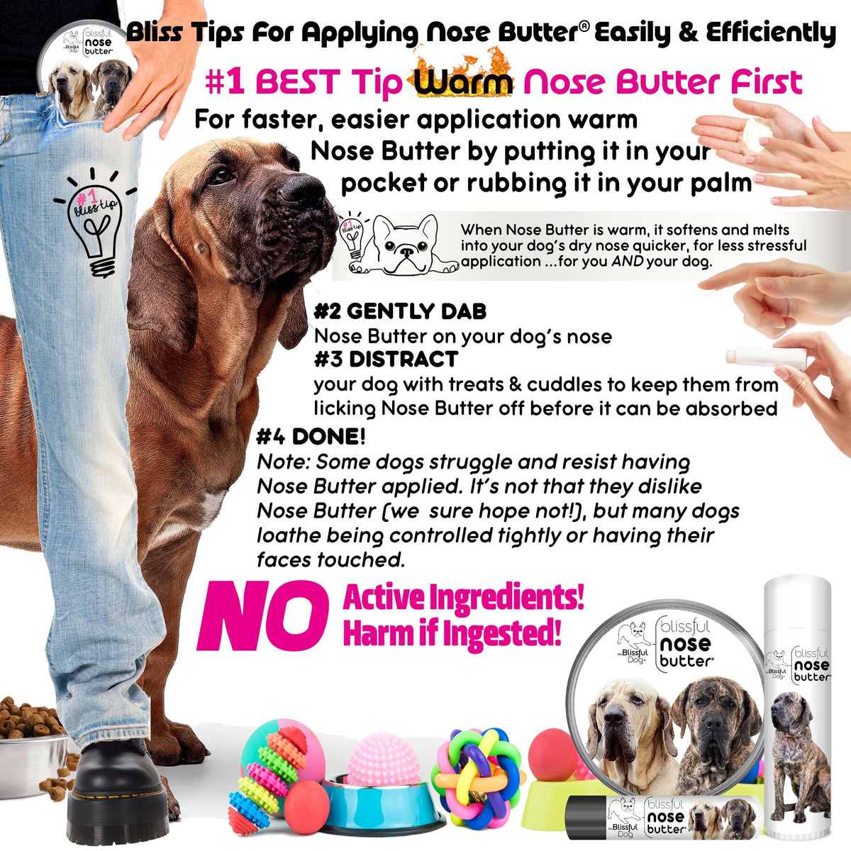Many dogs have a tendency toward a dry, crusty nose condition, frequently called nasal hyperkeratosis. While any dog can have this condition, some breeds have even more of a predisposition toward dry noses; French Bulldogs, Boxers, Pugs, Bulldogs, most Bully types, Mastiff breeds and their mixes. Nose Butter was developed specifically for this condition. Nose Butter moisturizes rough, dry crusty dog noses. All natural, rich moisturizers soften and smooth your dogs dry, crusty, cracked nose and works like a healing balm. Nose Butter is individually handcrafted in far northern Minnesota (yes, it is science fiction cold in the winter) using all natural and organic good stuff: shea butter, olive oil, castor oil, avocado oil, almond oil, coconut oil, beeswax and cocoa seed butter. Available in Unscented and Lightly Scented with Cedarwood, Cypress and Ylang Ylang. NOSE BUTTER USAGE: DAB a bit onto your dogs nose 1-3x a day for 2-3 days (until nose improves) and then as needed for maintenance (usually1-2x a week). DISTRACT with a treat (keeps them from licking NOSE BUTTER off while it moisturizes). DONE! Complete directions, tips, hints and dog nose info is available on product details pages.