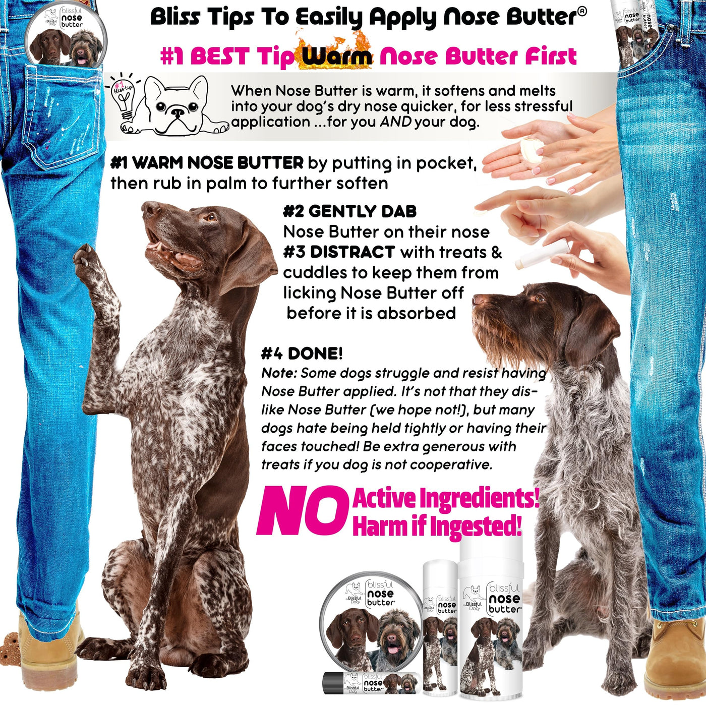 Many dogs have a tendency toward a dry, crusty nose condition, frequently called nasal hyperkeratosis. While any dog can have this condition, some breeds have even more of a predisposition toward dry noses; French Bulldogs, Boxers, Pugs, Bulldogs, most Bully types, Mastiff breeds and their mixes. Nose Butter was developed specifically for this condition. Nose Butter moisturizes rough, dry crusty dog noses. All natural, rich moisturizers soften and smooth your dogs dry, crusty, cracked nose and works like a healing balm. Nose Butter is individually handcrafted in far northern Minnesota (yes, it is science fiction cold in the winter) using all natural and organic good stuff: shea butter, olive oil, castor oil, avocado oil, almond oil, coconut oil, beeswax and cocoa seed butter. Available in Unscented and Lightly Scented with Cedarwood, Cypress and Ylang Ylang. NOSE BUTTER USAGE: DAB a bit onto your dogs nose 1-3x a day for 2-3 days (until nose improves) and then as needed for maintenance (usually1-2x a week). DISTRACT with a treat (keeps them from licking NOSE BUTTER off while it moisturizes). DONE! Complete directions, tips, hints and dog nose info is available on product details pages.