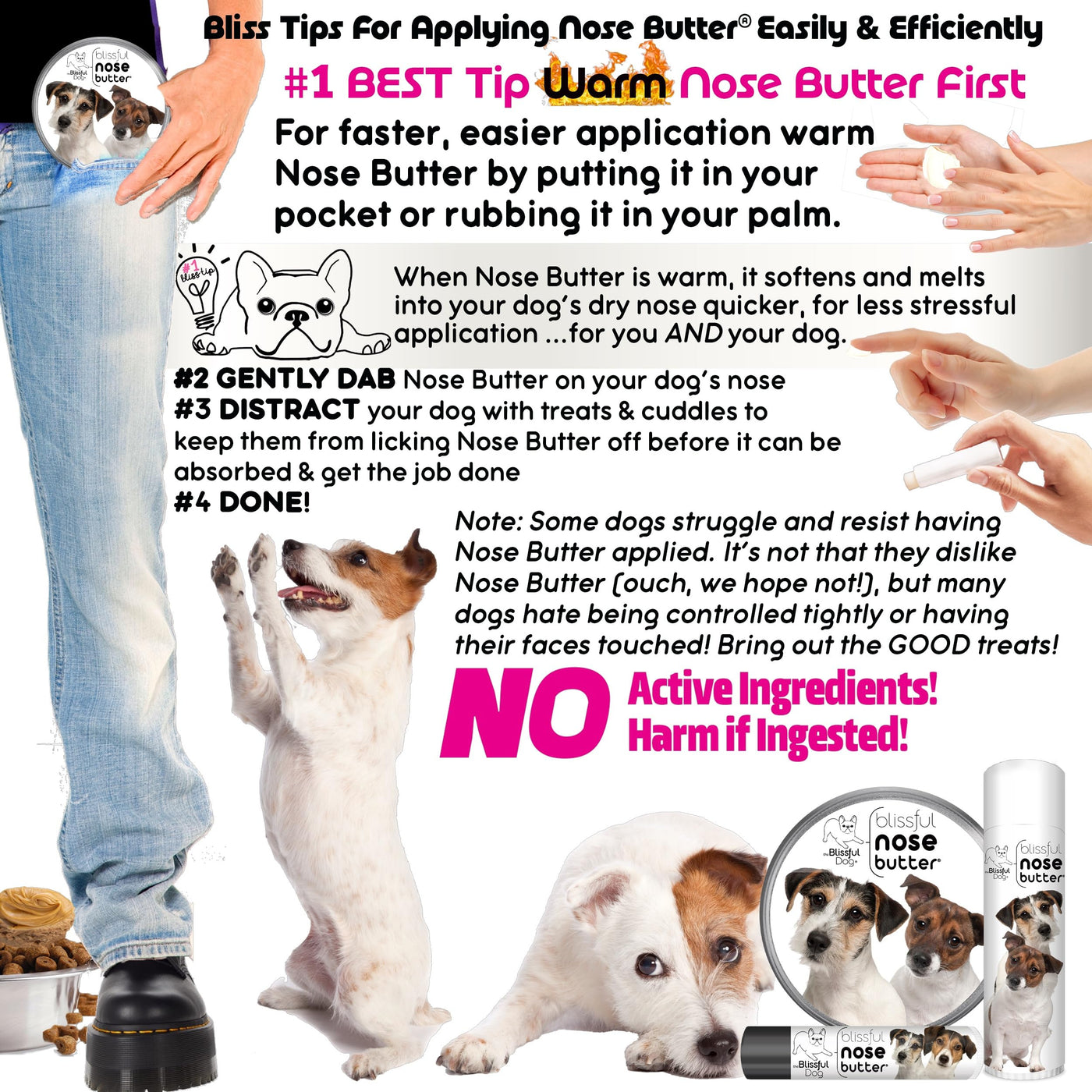 Q: Is there a recommended method to distract my dog during application?A: Yes, it is recommended to distract your dog with a treat while applying the nose butter to prevent them from licking it off immediately.