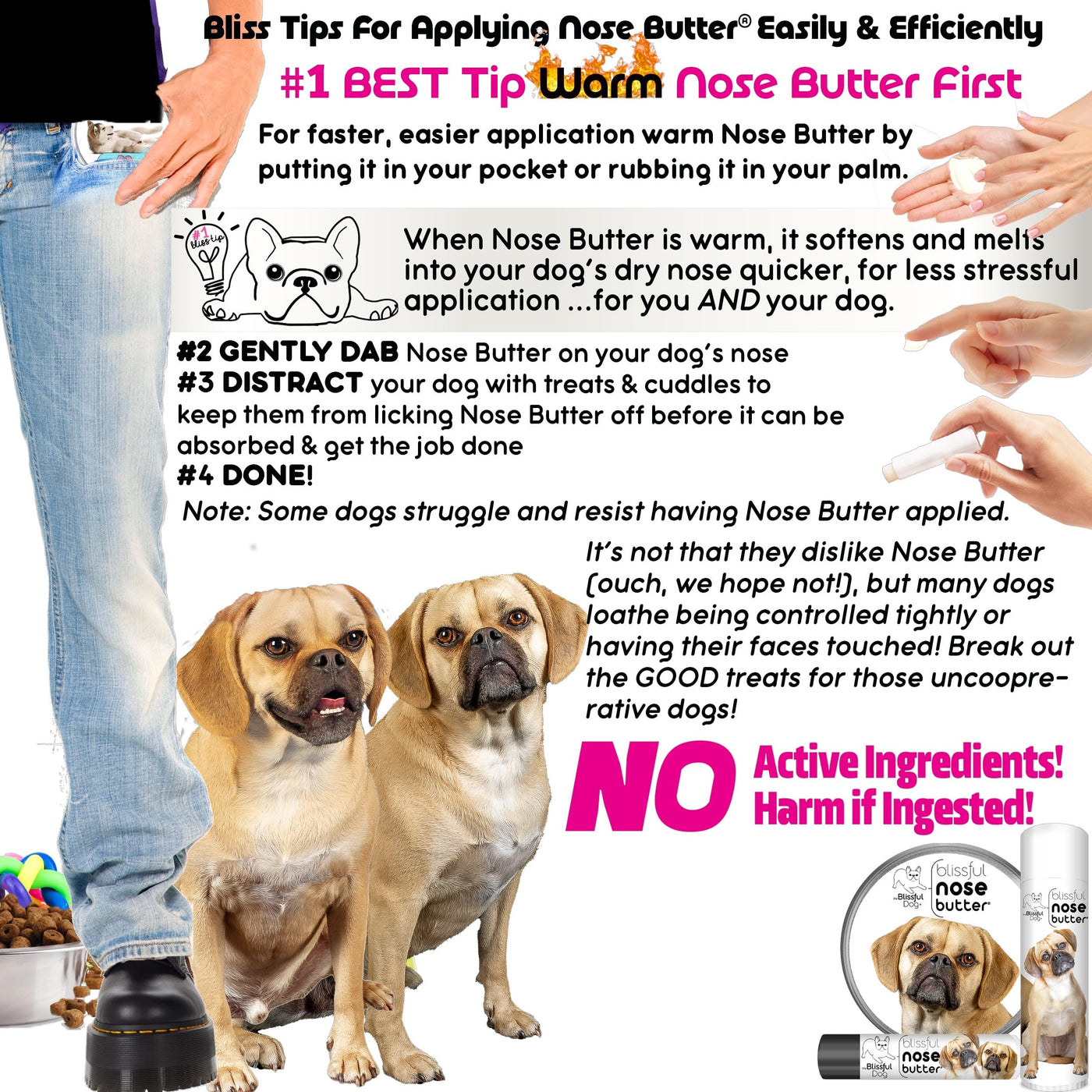Many dogs have a tendency toward a dry, crusty nose condition, frequently called nasal hyperkeratosis. While any dog can have this condition, some breeds have even more of a predisposition toward dry noses; French Bulldogs, Boxers, Pugs, Bulldogs, most Bully types, Mastiff breeds and their mixes. Nose Butter was developed specifically for this condition. Nose Butter moisturizes rough, dry crusty dog noses. All natural, rich moisturizers soften and smooth your dogs dry, crusty, cracked nose and works like a healing balm. Nose Butter is individually handcrafted in far northern Minnesota (yes, it is science fiction cold in the winter) using all natural and organic good stuff: shea butter, olive oil, castor oil, avocado oil, almond oil, coconut oil, beeswax and cocoa seed butter. Available in Unscented and Lightly Scented with Cedarwood, Cypress and Ylang Ylang. NOSE BUTTER USAGE: DAB a bit onto your dogs nose 1-3x a day for 2-3 days (until nose improves) and then as needed for maintenance (usually1-2x a week). DISTRACT with a treat (keeps them from licking NOSE BUTTER off while it moisturizes). DONE! Complete directions, tips, hints and dog nose info is available on product details pages.