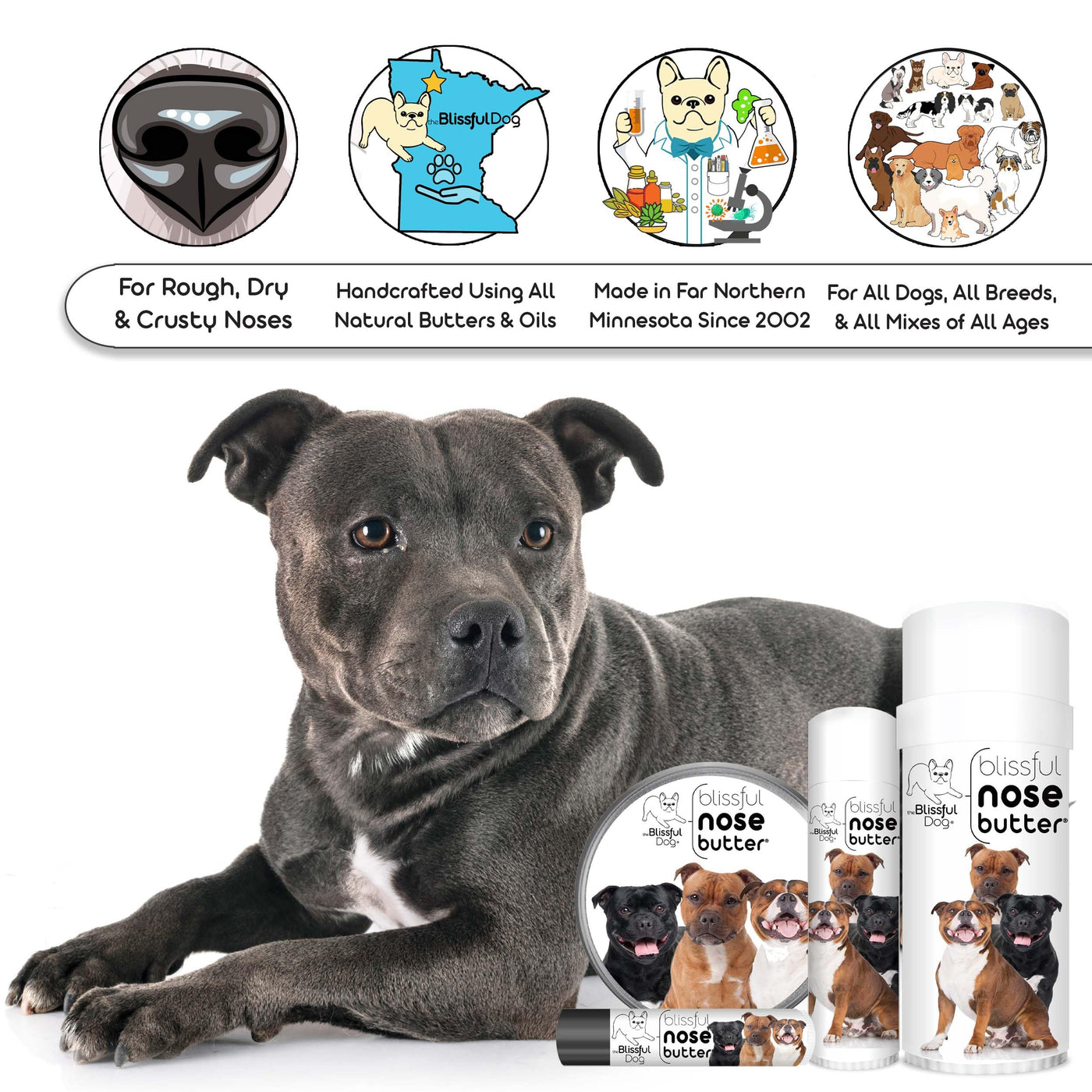 Many dogs have a tendency toward a dry, crusty nose condition, frequently called nasal hyperkeratosis. While any dog can have this condition, some breeds have even more of a predisposition toward dry noses; French Bulldogs, Boxers, Pugs, Bulldogs, most Bully types, Mastiff breeds and their mixes. Nose Butter was developed specifically for this condition. Nose Butter moisturizes rough, dry crusty dog noses. All natural, rich moisturizers soften and smooth your dogs dry, crusty, cracked nose and works like a healing balm. Nose Butter is individually handcrafted in far northern Minnesota (yes, it is science fiction cold in the winter) using all natural and organic good stuff: shea butter, olive oil, castor oil, avocado oil, almond oil, coconut oil, beeswax and cocoa seed butter. Available in Unscented and Lightly Scented with Cedarwood, Cypress and Ylang Ylang. NOSE BUTTER USAGE: DAB a bit onto your dogs nose 1-3x a day for 2-3 days (until nose improves) and then as needed for maintenance (usually1-2x a week). DISTRACT with a treat (keeps them from licking NOSE BUTTER off while it moisturizes). DONE! Complete directions, tips, hints and dog nose info is available on product details pages.