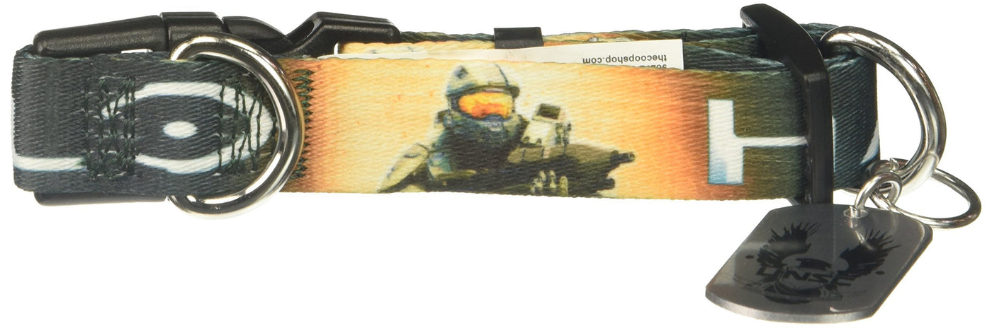 The officially licensed Master Chief Dog Collar has nylon webbing and reinforced stiching for durabllity . It has a gunmetal dogtag with a printed UNSC logo. It is 9-11 inch colllar.