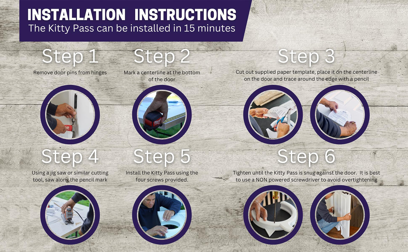 Q: How easy is it to install The Kitty Pass?A: Installing The Kitty Pass is straightforward and typically takes about 15-25 minutes. It comes complete with installation directions and a template for cutting the door perfectly.