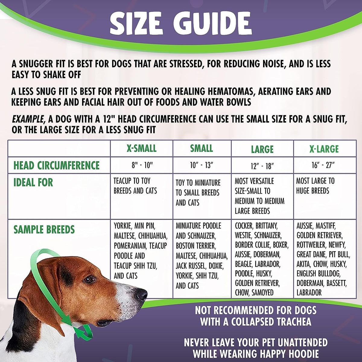SIZE GUIDE. Please refer to listing photos for measuring instructions and the size guide for dog ear hood. These no flap ear wraps for dogs has a snug fit and are often more helpful when a pet is very upset (such as force drying and fireworks)-- perfect anxiety relief for dogs!