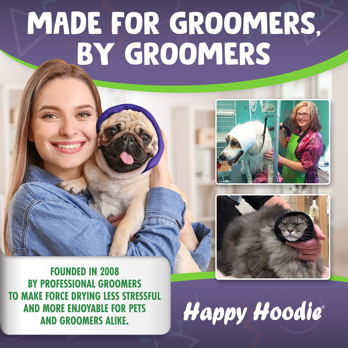 MADE FOR GROOMERS, BY GROOMERS. With over 27 years of combined experience in the dog and cat grooming industry, the founders of Zoni Pets, LLC set out to create Happy Hoodie - a soft, expandable fabric band that makes force drying (and grooming) less stressful for pets. Happy Hoodie is the FORCE DRYING MIRACLE Hoodie for pets that groomers have come to love! Perfect dog ear covers for bath!