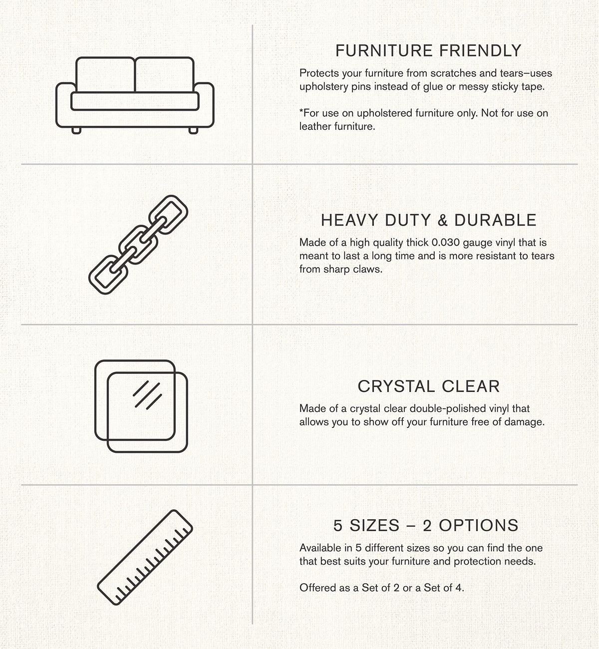 Stop your pets from using your furniture as a scratching post! Our Cat Scratch Shields are high quality, very pliable and flexible, double polished, 'Glass' clear vinyl 0.030 gauge thick. (NOTE: other products are much thinner and less durable than our brand). The Shields are safely held in place to upholstered furniture with the provided Upholstered Furniture Pins, extra pins are included. : Do not let your expensive furniture be ruined by your cats or dogs anymore! CAT SCRATCH SHIELDS provide near invisible protection against their clawing and scratching. FIVE sizes (21' x 5.5', 18' x 5.5', 14' x 5.5', 11' x 5.5' and 8' x 5.5') to suit the needs of any piece of furniture you have and for maximum furniture protection -- whether it is a couch, chair, sofa, recliner or love seat, this product will work for them all. Best of all you can cut them to size if needed as well! We do not use glue or messy sticky tape that sticks to your Furniture, but custom designed Upholstery Pins to apply to Upholstered Furniture. DO NOT USE ON LEATHER OR NATURAL FABRICS!!!