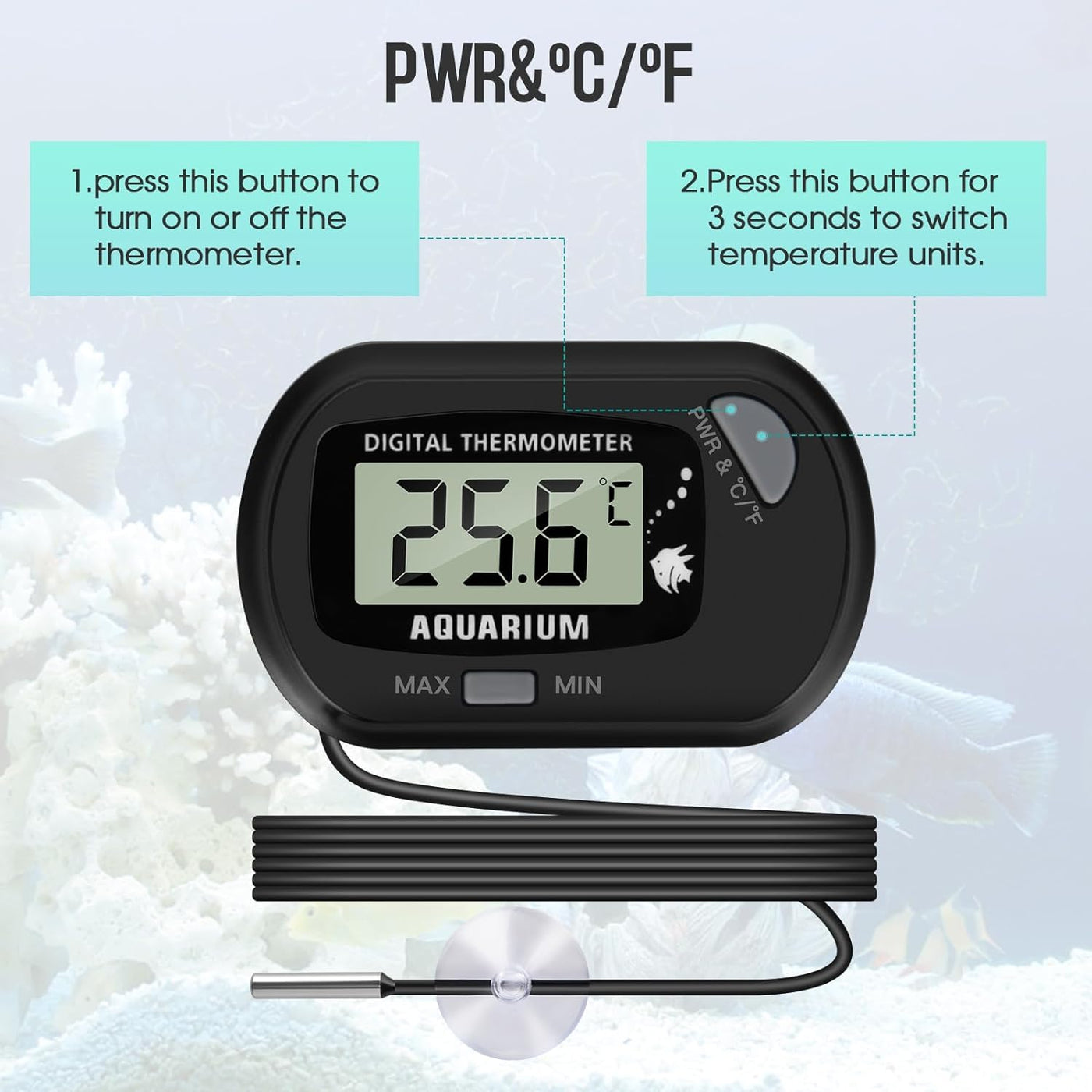 Note: 1. The Main Display Unit Of The Fish Tank Thermometer Must Be Kept Away From Water Because It Is Not Waterproof. 2. The Sensor Probe Is Waterproof And Can Be Immersed In Water 3. Press And Hold The Power (Pwr) Button To Turn On. Hold The Power Button For 3 Seconds To Turn Off. Product Features: 1. Thlevel Aquarium Thermometer Is Suitable For Various Aquariums And Water Tanks, Such As Fresh Water, And Sea Water. 2. It Can Also Be Used To Monitor The Living Temperature Of Reptiles, Lizards, Turtles, Etc. Specifications: Aquarium Thermometer With Remote Diving Sensor Probe And Lcd Display. With 2 High-Quality Suction Cup Mounts, Easy To Install Temperature Range: -58F To +158F (-50C To +70C), With Accuracy +/-1? Battery: Lr44 Button Battery (Included) Sensor Probe Cable Length: Approx. 3 Feet (1 Meter) Item Dimension: Approx. 2.3 X 1.5 X 0.6 Inches (5.8 X 3.8 X 1.5 Cm) Package Include: 4X Fish Tank Thermometers