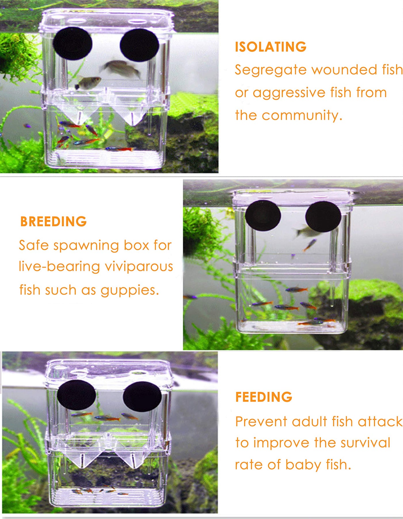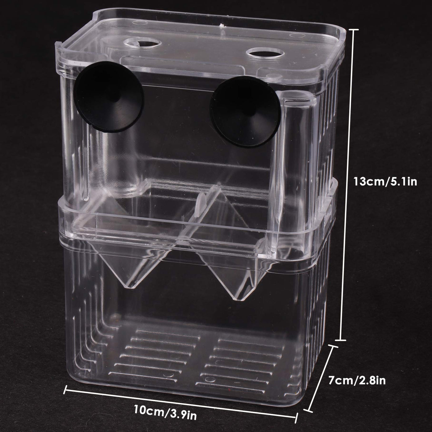 Tiberham Floating Fish Hatchery Isolation Box - A Safe House For Your Fishes And Friesmain Features:- Innovative Double Layer Isolation Design To Segregate Aggressive Fish From The Community And Improve The Survival Rate Of Baby Fish- Tiny Side And Bottom Vents Ensure Optimum Water Circulation And Holes On The Top Cover Allows For Easy Feeing Of Fish- Premium Quality Acrylic Material With Crystal Like Transparency Allows You To Observe The Mother Fish And Baby Fish Easily And Freely- Versatile Breeder Box Works Wonderfully For Live-Bearing Viviparous Fishes As Well As Displaying Fighting Fishes- Comes With Strong Suction Cups For The Fish Hatchery Breeding Box To Attach Firmly To The Side Of Aquariumspecifications:Material: Acryliccolor: Clearsize: 13 * 10 * 7 Cm / 5.1 * 3.9 * 2.8 Inpackage Includes:1 * Fish Hatchery Breeding Box3 * Suction Cup