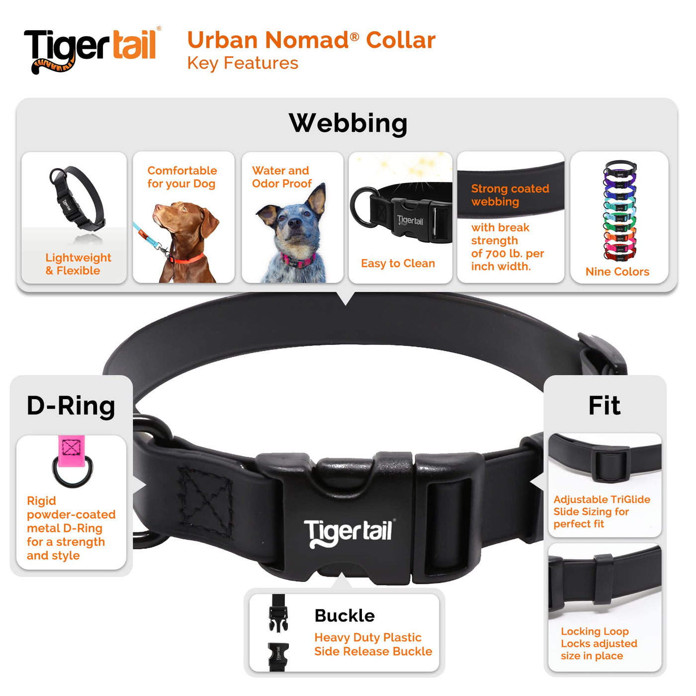 Tiger Tail Urban Nomad Dog Collar | Waterproof, Odor Proof, Durable, Anti-Mat & Lightweight | Premium Coated Nylon | For Large, Medium & Small Breed Pets | Black, Medium