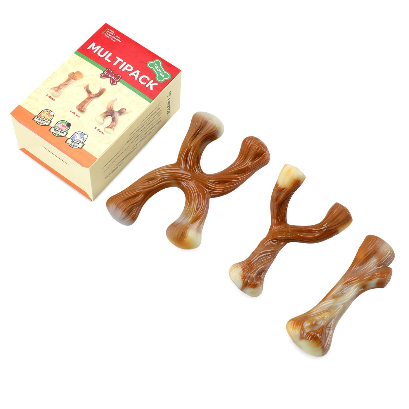 Q: How do the different shapes of the chew toys benefit my dog?A: The three fun shapes— I-Bone, X-Bone, and Y-Bone— provide various chewing angles and grip, catering to your dog's natural instincts and enhancing their chewing experience.