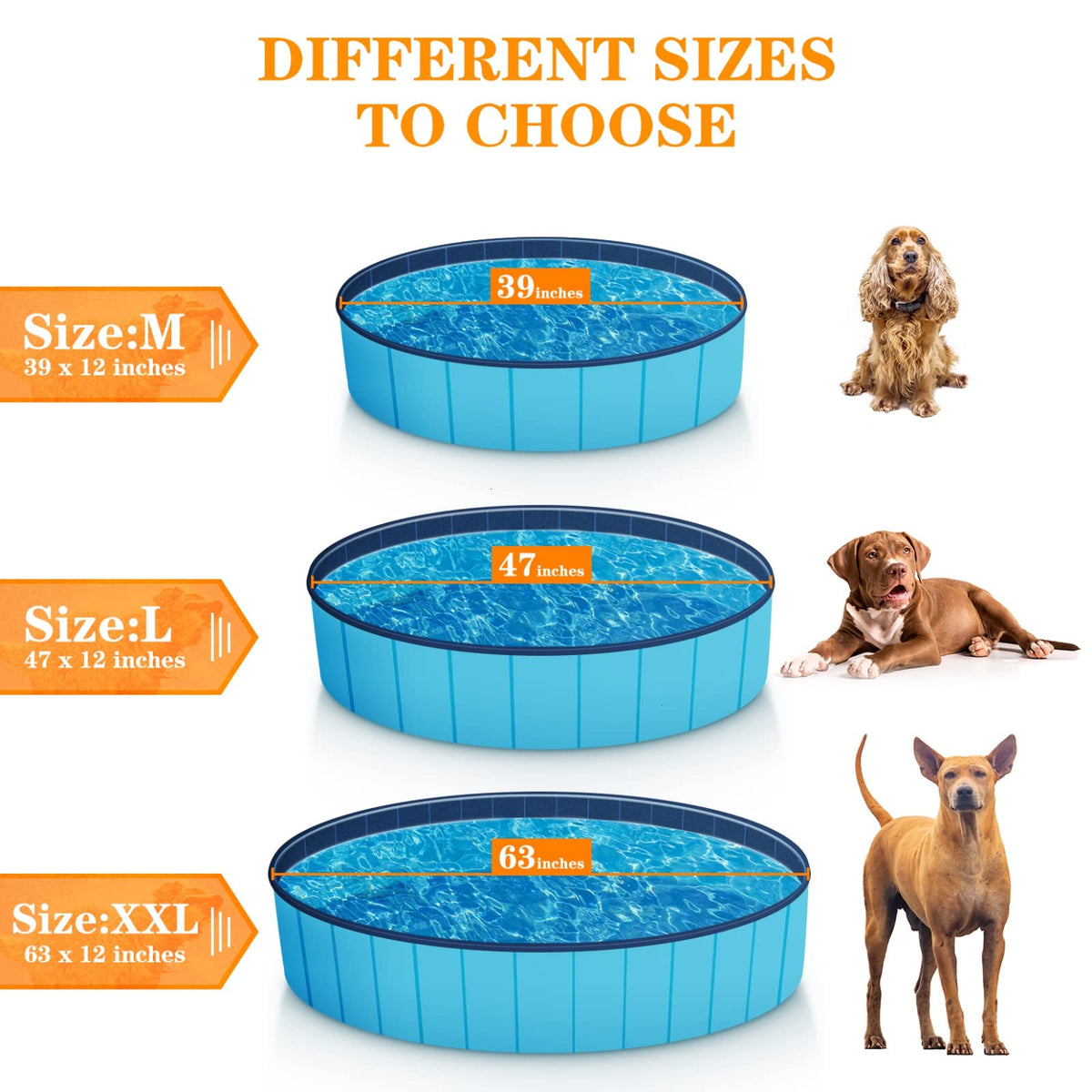 Q: What sizes does the Timoo Foldable Dog Pool come in?A: The Timoo Foldable Dog Pool is available in three common sizes: 39 inches, which can accommodate 2 small dogs or 1 medium dog; 47 inches, suitable for 2 medium dogs or 1 large dog; and 63 inches, which can hold 6 medium dogs, 3 large dogs, or 2 extra-large dogs.