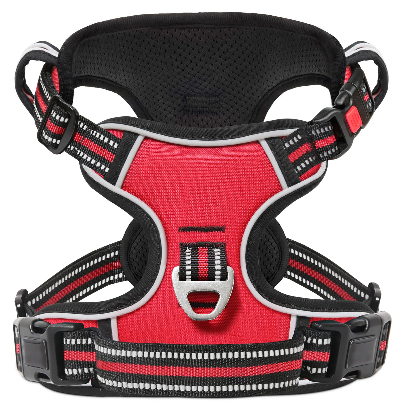 Safety Information 1. Always Double-Check If All The Straps And Buckles Are Fastened Correctly Before Heading Out With Your Dog. Try To Move The Harness From Side To Side, Making Sure It Doesn 'T Slide Over Too Far To One Side Or Another. 2. Remember The 2-Finger Rule: You Should Be Able To Fit 2 Fingers Between Your Dog And Any Part Of The Harness After Proper Adjustment. It Also Should Not Constrict Your Dog 'S Movement Or Rub Against The Skin. 3. Please Keep The Harness And Its Package Bag Away From Babies Or Children To Avoid Any Possible Choking Hazard. 4. The Harness Is Not Intended For All-Day Wearing. Please Only Have Your Dog Wear It Only During Necessary Activities, Such As Dog Walks Or Training. 5. If Your Dog Appears Uncomfortable When Wearing The Harness, Or You Think The Harness Does Not Suit Your Dog, Please Take It Off And We Will Take Care Of The Rest.Directionsuser Instructions: 1. Unbuckle: Unbuckle The Chest Straps. 2. Release The Chest Buckle: No Need Go Over Dog 'S Head Through , With The D-Ring And The Logo Facing Up On The Back. 3. Adjust: Adjust The Neck And Chest Straps Accordingly To Fit Your Dog 'S Body. Adjust 4 Straps To Fit Your Dog 'S Body. 4. Secure: Buckle Up On Both Sides Of The Chest Using 2 Side-Buckles. 5. ''2-Finger Rule '': You Should Be Able To Fit 2 Fingers Between Your Dog 'S Body And Any Part Of The Harness..