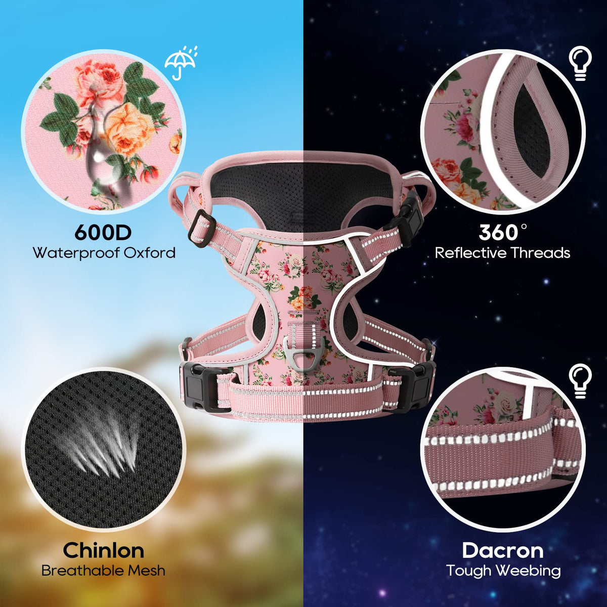 Safety Information 1. Always double-check if all the straps and buckles are fastened correctly before heading out with your dog. Try to move the harness from side to side, making sure it doesn t slide over too far to one side or another. 2. Remember the 2-finger Rule: You should be able to fit 2 fingers between your dog and any part of the harness after proper adjustment. It also should not constrict your dog s movement or rub against the skin. 3. Please keep the harness and its package bag away from babies or children to avoid any possible choking hazard. 4. The harness is not intended for all-day wearing. Please only have your dog wear it only during necessary activities, such as dog walks or training. 5. If your dog appears uncomfortable when wearing the harness, or you think the harness does not suit your dog, please take it off and we will take care of the rest.DirectionsUser Instructions: 1. Unbuckle: Unbuckle the chest straps. 2. Release the chest buckle: NO need go over dog s head through , with the D-ring and the Logo facing up on the back. 3. Adjust: Adjust the Neck and Chest Straps accordingly to fit your dog s body. Adjust 4 straps to fit your dog s body. 4. Secure: Buckle up on both sides of the chest using 2 side-buckles. 5. 2-finger rule : You should be able to fit 2 fingers between your dog s body and any part of the harness..