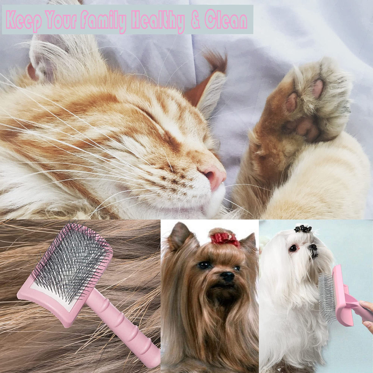 ?????TinyPoint Large Long Pin Slicker Brush?CONFIRM TinyPoint logo behind slicker brush when you receive the package. The dog grooming brush is specifically developed for long-haired dogs, 25mm(1'') long stainless steel pin and 135° curved pins brush, which more fit to dogs and cats, the dog slicker brush with firm stainless-steel pins that easily brush away loose hair, undercoat, and tangles. Designed longer than standard pins to remove hair, save time and energy during pet grooming. | ?????Keep Your Family Healthy & Clean?Google surveys show that most people see their pets as family and want them to be healthy and clean,removes undercoat,tangled hair,dander,dirt for pets are needed frequently.This brush for long haired dogs will solve your problem,the dog cat shedding brush will make your pet feel comfortable and enjoy when grooming. | ?????Choose the Right Dog&Cat Hair Brush?For long haired or double haired dogs, this large long pin slicker brush can remove dead hair from underneath and stimulate new hair growth, and the grooming brush makes it easier for the penetrate the surface of the skin when taking a shower. Dogs&cats often have hair loss problems, use the slicker brush every day can keep their hair from flying around. | ?????Correct professional grooming method?Brush twice a week for short smooth hair and daily for long smooth hair. The correct usage is to lift the hair, follow the direction of the hair, comb up and down, part by part, so that when brushing, the grooming brush will not to hurt and injure the dog. A beautiful and clean dog cat will appear in front of your eyes because of the large long pin slicker brush. | ?????Support Most Dogs&Cats?Dogs like Giant Poodle, Samoyed, Great Pyrenees, Poodle, Bichon Frise, West Highlander, Pomeranian, Silver Fox, etc. And Cats like Ragdoll, Persian, Maine Coon, Chinchilla, Oriental Longhair, British Longhair, etc. It’s smart of you to choose the long pin slicker brush if you are very picky with pet grooming tools. Don't hesitate to Add to Cart and get this large long pin slicker brush.