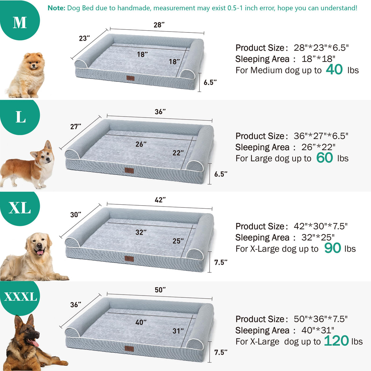 Q: What sizes of the TJSOULER Orthopedic Dog Bed are available?A: The TJSOULER Orthopedic Dog Bed is available in multiple sizes to accommodate dogs of various weights and breeds. The sizes include Medium (28x23x6.5 inches), Large (36x27x6.5 inches), XL (42x30x7.5 inches), and XXXL (50x36x7.5 inches). Please choose the size based on your dog's weight to ensure a perfect fit.
