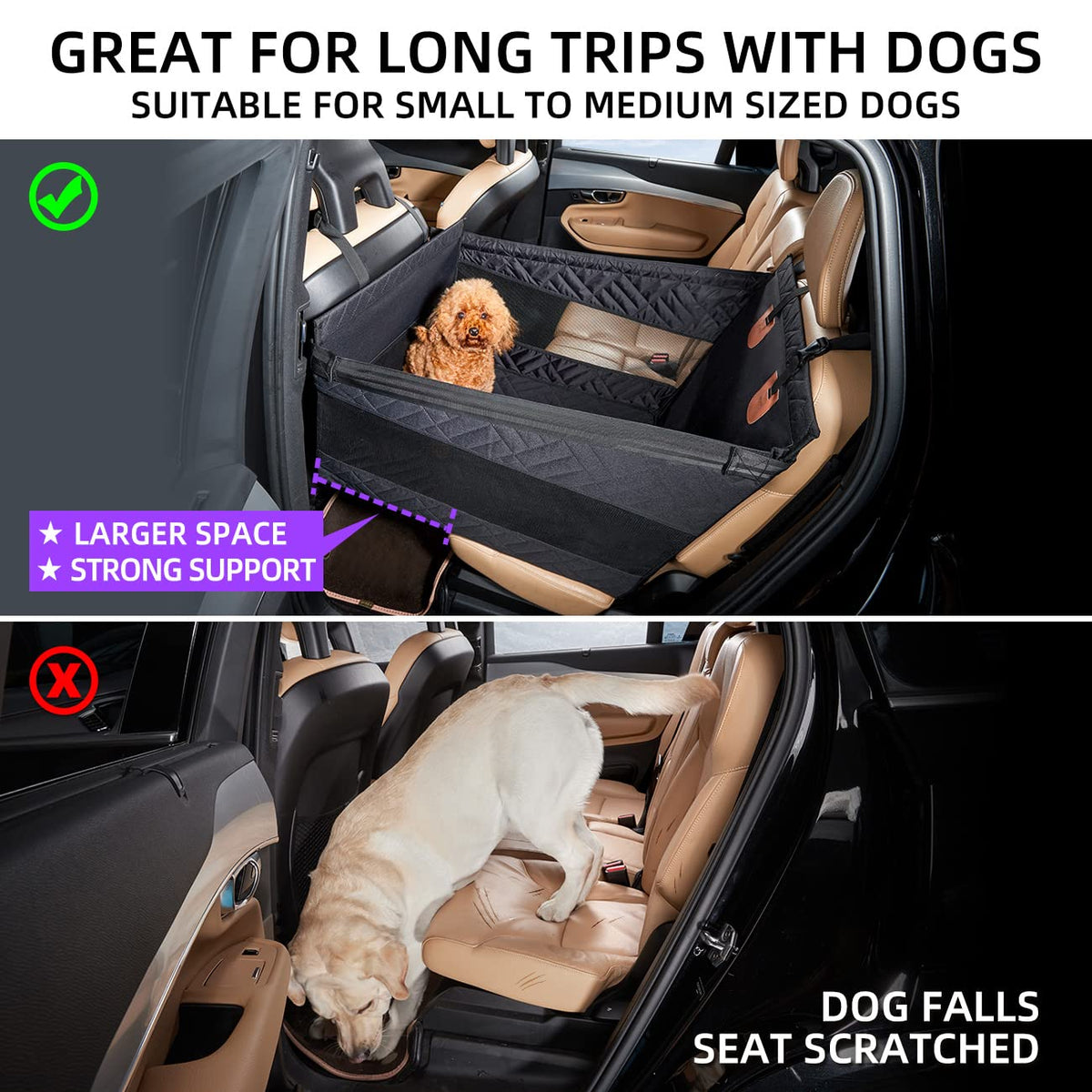 TKYZ Dog Car Seat for Medium Dogs,Back Seat Extender for Dogs,Large & Small Dog Car Seat,Dog Car Seat for Large Medium Small Dogs,Car Dog Bed,Pet Car Seat for Car SUV Truck ?Back seat into car dog bed?The back seat extender for dogs turns all the space in the back seat into a resting space for dogs. Dog car seat provide a larger and more comfortable resting space for dogs. ?Prevent dog falls?During the drive, if the emergency brake or your dog is more mischievous and active, it is easy to fall from the back seat.TKYZ car dog seat helps you solve this problem. ?Waterproof, wear-resistant and non-slip?Back seat cover for dogs is waterproof, easy to clean after getting dirty;dog car seat on both sides of the non-slip design,dog hammock for car is not easy to move, the dog in the car bed mattress is not easy to slide; The pet car seat is made of thicker, hard-wearing fabric, so it is more durable. ?Universal Fitment?The size of dog car seat for medium dogs is 28.7*22*21.5in.The size of dog car seat for small dogs is 22*22*21.5in.First of all, the car seat should have a headrest bar.Car dog travel bed Mattress suitable for cars suvs and trucks.The dog seat is very easy to install. ?Fits most dogs?TKYZ dog seats for almost all sizes of dogs.Small dog seat for small to medium sized dogs (e.g. pit bull), large dog seat for medium to large sized dogs (e.g. Labrador).