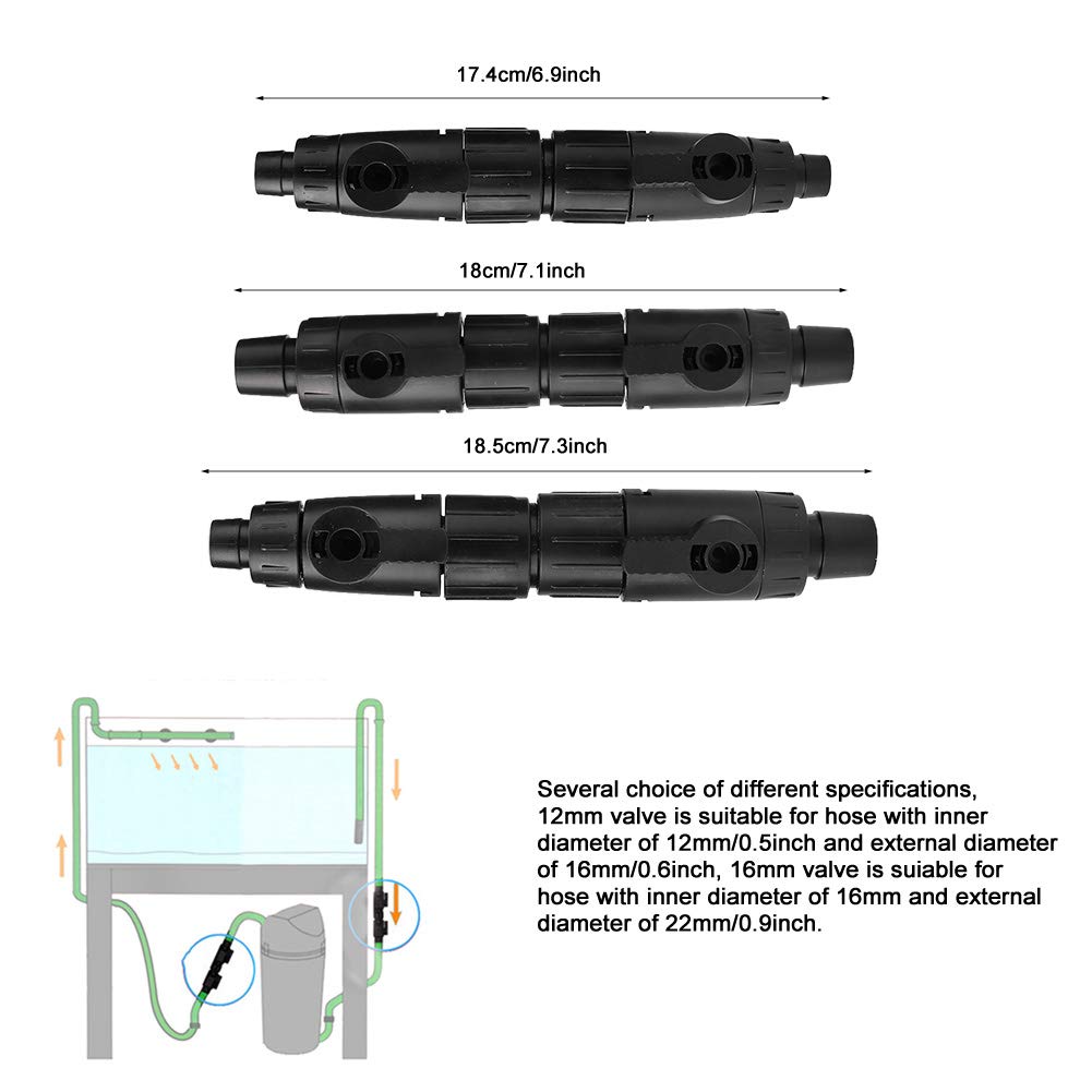 ?3 Sizes to Choose?Several choice of different specifications 12mm valve is suitable for hose with inner diameter of 12mm/0.5inch and external diameter of 16mm/0.6inch 16mm valve is suiable for hose with inner diameter of 16mm and external diameter of 22mm/0.9inch.aquarium quick release. aquarium tubing connectors. aquarium tubing.