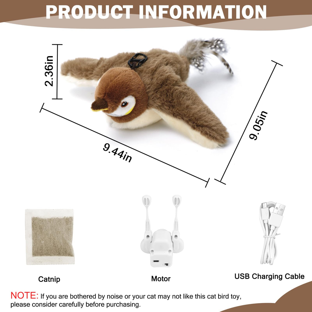 Interactive Cat Toys For Indoor Cats: When The Cats Touch This Bird Cat Toys For Bored Indoor Adult Cats, The Automatic Built-In Motion Sensor Will Flap The Wings And Chirp To Attract Your Kitty To Kick And Play. Perfect Cat Gifts For Christmas And New Year. Cat Bird Toy: The Flapping Bird Cat Toy Can Make Lifelike Chirping Sounds And Flap Wings, Which Looks Like A Real Woodpecker To Catch Your Cat'S Eyes And Keep The Kittens Engaged In Real Self Play Time, Reducing Boredom When They Stay Alone. Catnip Toys For Cats: The Simulated Chirping Bird Cat Toy Comes With Catnip That Has A Strong Attraction To Most Cats. The Back Of The Cat Nip Toys Cat Has A Zipper That Can Keep Or Refill The Catnip Inside. The Flying Bird Cat Toys Catnip Not Only Can Reduce Stress In Cats, But Cat Products Also Helps Your Cat To Get Lounging Cats Up And Moving. Soft And Safe: This Chirping Bird Cat Toy Flapping Wings Is Made Of High Quality And Best Short Plush, Pp Cotton And Real Feathers, Which Is Durable For Your Kitten To Chew, Bite And Snuggle. Flappy Bird Cat Toy Is A Great Cat Interactive Toys For Bored Indoor Cats And Kittens. Hanging Cat Toy: The Flying Bird Cat Toys For Indoor Cats Has A Clasp On The Back, You Can Use It As A Door Hanging Cat Toy, Cat Fishing Pole Toy, Cat Wand Attachment Toys Or Cat Wand Toy Replacement. Usb Chargeable: This Electronic Cat Chew Toy Can Be Recharge Fast And Keeps Working A Long Time Per Charge. The Mice Cat Toys For Indoor Cats Will Stay Quiet To Save Battery Power When Left Alone. Washable: When You Take The Moving Sensor And Catnip Pouch Out, You Can Clean This Bird Simulation Toy For Cats By Hand Or Washing Machine.