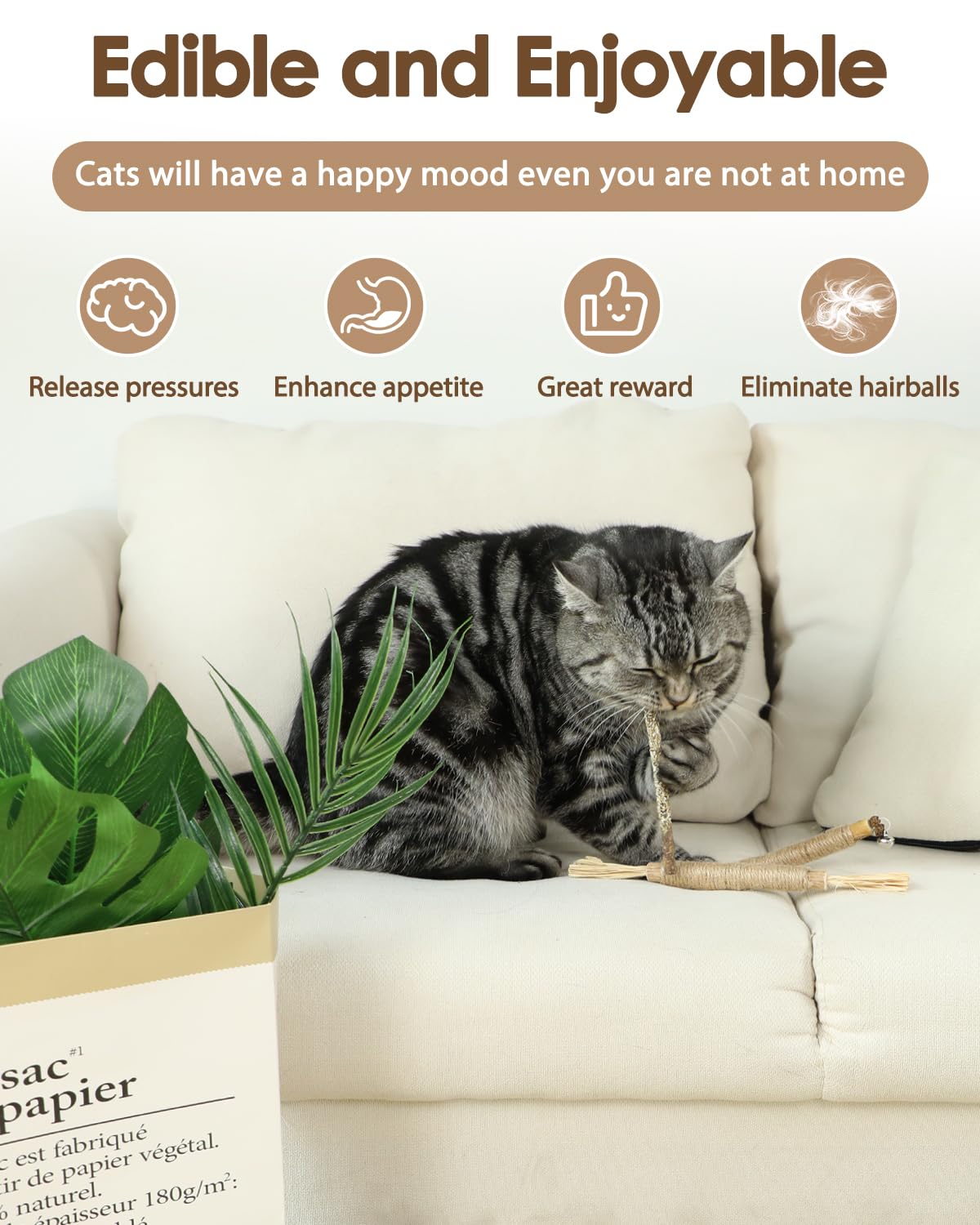 Natural Silvervine Sticks: Tocirelo Silvervine Sticks For Cats Are Made From Natural Silvervine, Raffia, Sisal String And Silvervine Fruit, Dried By High-Temperature And Handmade In The Clean Workshop, The Cat Toys Are Absolutely Safe For Indoor Cats To Chew And Play. Chew Toy For Cleaning Teeth: Cat Chew Toy Can Clean Your Cats' Teeth While Chew The Stick Toy, Which Can Effectively Remove Plaque And Tartar, Protect Oral Health And Keep Fresh Breath. Make Cats Happy: Indoor Cats Need A Variety Of Stimuli To Keep Them Happy. Silvervine Has A Smell Like Catnip, Which Produces A Euphoric Effect On Cats And Help Cats Relieve Stress, Get Relax And Moving In Promoting Exercise. Make Cats Health: The Silvervine Sticks Are Rich In Plant Fiber, Supplement Vitamins, Promote Gastrointestinal Motility, And Discharge Hairballs & Increase Appetite, Make Your Cat Healthier. Easy To Use: Including 6 Pack Cat Stick Toys. The Silvervine Sticks For Cats Are Filling With Raffia And String Fixation Makes The Cat Stick Toy More Durable. This Cat Enrichment Toy Are Suitable All Indoor Cats. Feed Your Cats Directly. Your Cats Will Get Excited, Playful With Amusing And Funny Behaviors: Chewing, Rubbing, Licking, Running, Rolling, Mewing, Drooling. Best Cat Nip Toys: The Cat Toy Can Also Help Solve Problems Such As Chewing, Separation Anxiety, Long Teeth, Boredom, Weight Management, Running Training, Etc.Your Cat Will Be Intensely Attracted, Perfect Cat Nip Toy For Cats.