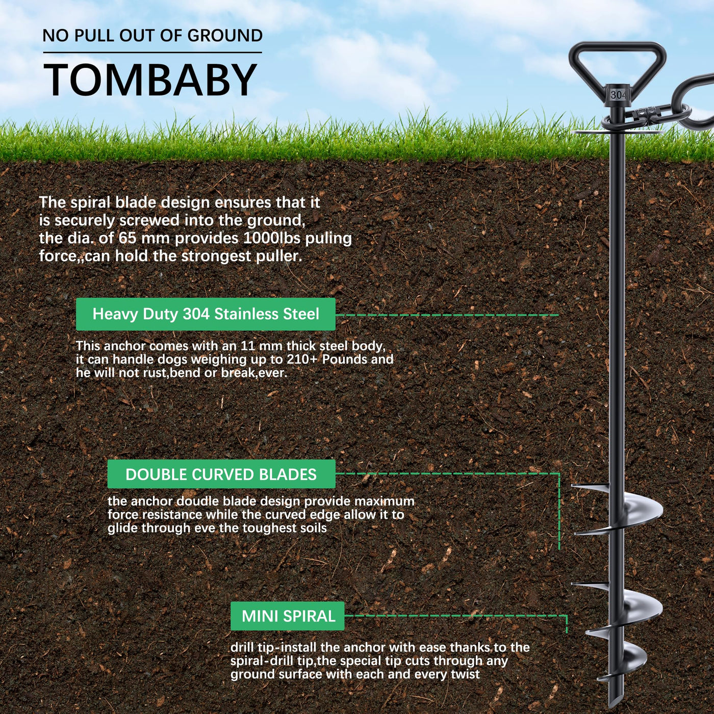 Tombaby Dog Tie Out Stake-Heavy Duty 304 Stainless Steel Dog Anchor, 360 Swivel Yard Stake For Dogs,Use Any For To 210 Lbs Dogs-