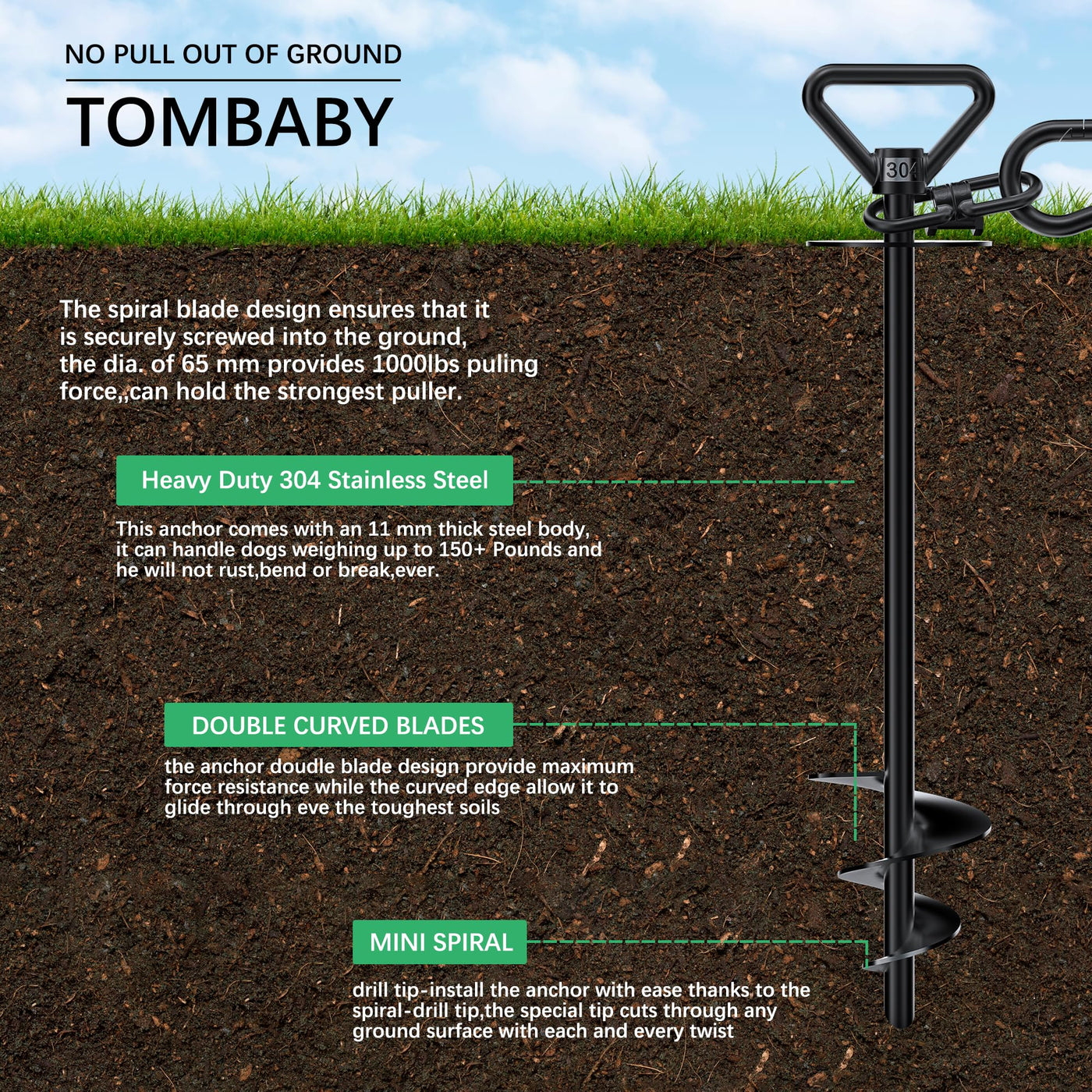 Tombaby Dog Tie Out Stake-Heavy Duty 304 Stainless Steel Dog Runner, Ground Anchor With 360 Swivel & Anti-Tangle,Use Any For To