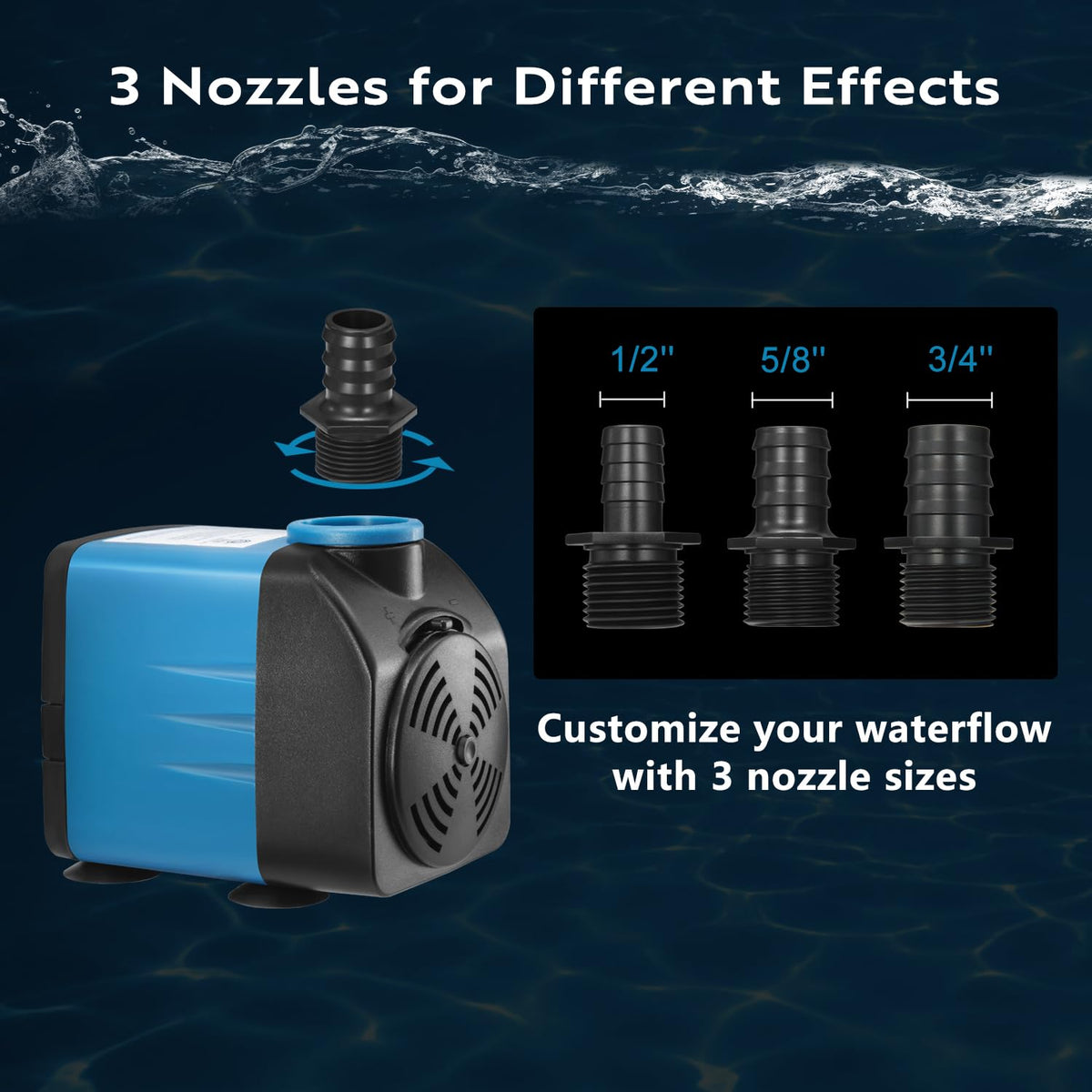 The TONGCHANT 35W pond pump with adjustable flow valve is a powerful, efficient solution for a wide range of water circulation needs. Running on 120V, it delivers up to 480 GPH and lifts water as high as 8.2 feet, making it ideal as an aquarium water pump, small water pump, or pond pump for outdoor ponds. The magnetic drive copper wire motor ensures reliable and long-lasting performance, while thermal protection shuts the pump off automatically at 185F to prevent overheating-simply reconnect power after it cools. This submersible water pump for fountain is built with durability in mind, featuring a wear-resistant stainless steel shaft, epoxy-sealed housing, and a quiet motor that minimizes vibration. Use it confidently indoors or outdoors, whether you need a fountain pumps submersible outdoor unit or a dependable waterfall pump for backyard features. It includes a flow control valve and three nozzle sizes (1/2, 5/8, 3/4) to suit different water effects. Just remember: higher flow means lower lift-adjust based on your setup. With four strong suction cups, the pump mounts securely on flat or vertical surfaces, ensuring stable operation. The 6-foot power cord offers flexibility for positioning in tanks, hydroponic systems, or water fountain pump outdoor installations. This model also works well as part of small fountain pumps submersible or pond pumps submersible outdoor systems. No tools are needed for cleaning-just disassemble by hand to keep the unit running smoothly. For best results in murky water, place the pump in a mesh filter bag to prevent debris from clogging it. Whether youre maintaining a water pump for fountain or creating a tranquil water feature, TONGCHANT delivers dependable flow with minimal effort.