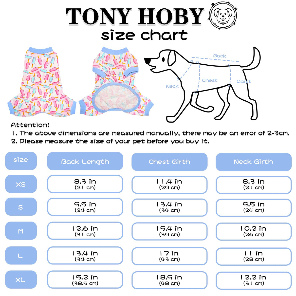 Tony Hoby Dog Pajamas High Quality, Focus On Grasping Every Production Detail, And Give The Dog The Most Intimate Care Size X-Small: Chest Girth Is 11.4', Back Length Is 8.3', Neck Girth Is 8.3' Small: Chest Girth Is 13.4', Back Length Is 9.5', Neck Girth Is 9.5' Medium: Chest Girth Is 15.4', Back Length Is 12.2', Neck Girth Is 10.2' Large: Chest Girth Is 17', Back Length Is 13.4', Neck Girth Is 11' X-Large: Chest Girth Is 18.9', Back Length Is 15.2', Neck Girth Is 12.2'