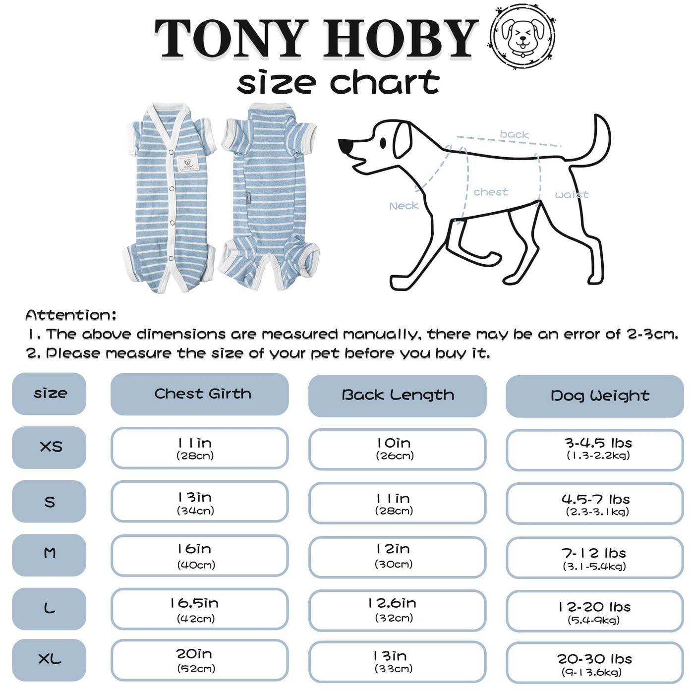 Q: What sizes are available for the TONY HOBY Dog Pajamas?A: The TONY HOBY Dog Pajamas are available in sizes XS, S, M, L, and XL. Each size corresponds to specific chest girth and back length measurements to ensure a comfortable fit for your pet.