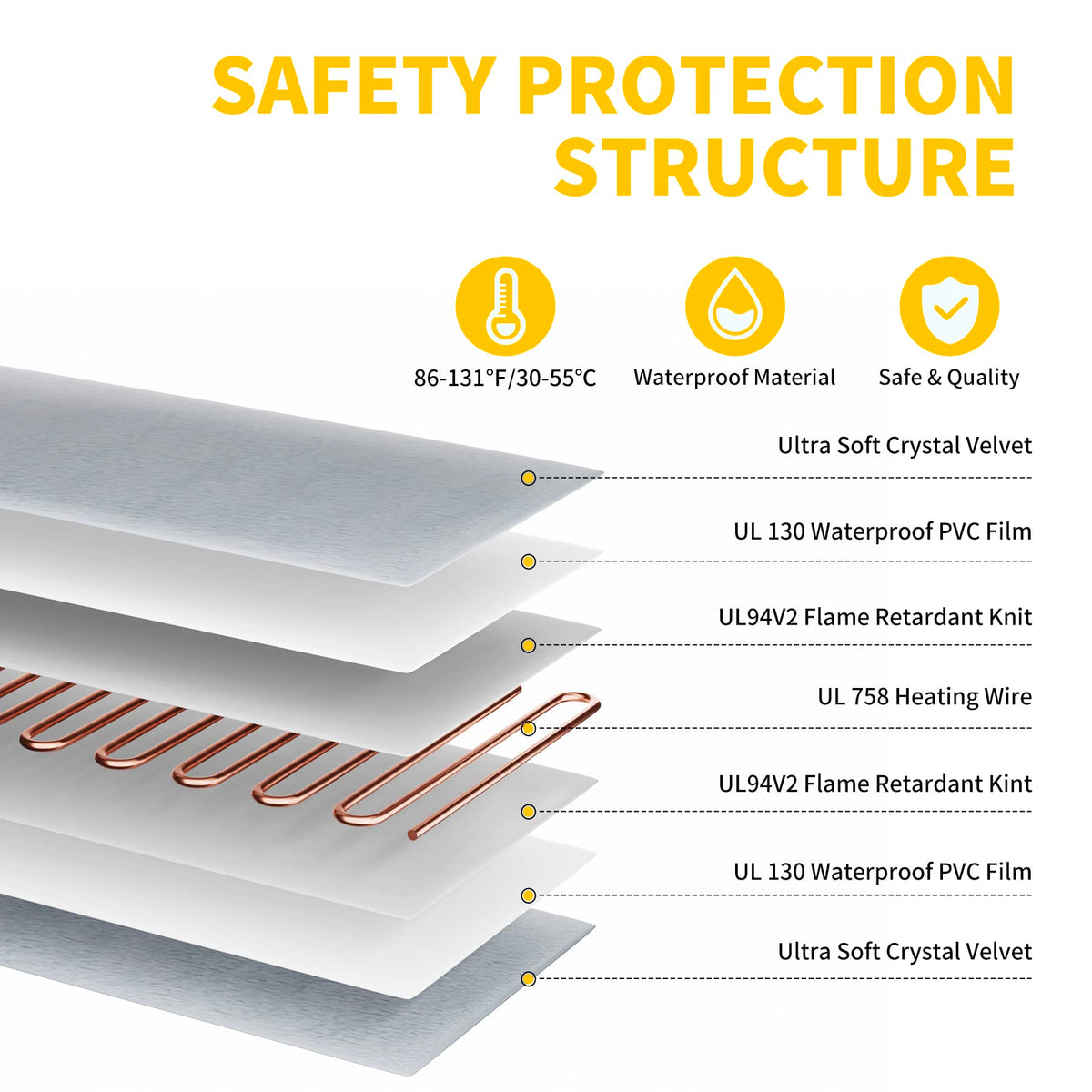 ??Safety and Secure Structure?7-layer protective structure with UL-certified heating wire protect pets from burns. Soft PVC envelope with waterproof and flame-retardant function. Built-in intelligent temperature sensor in the heating pad to prevent overheating to protect pets. Don