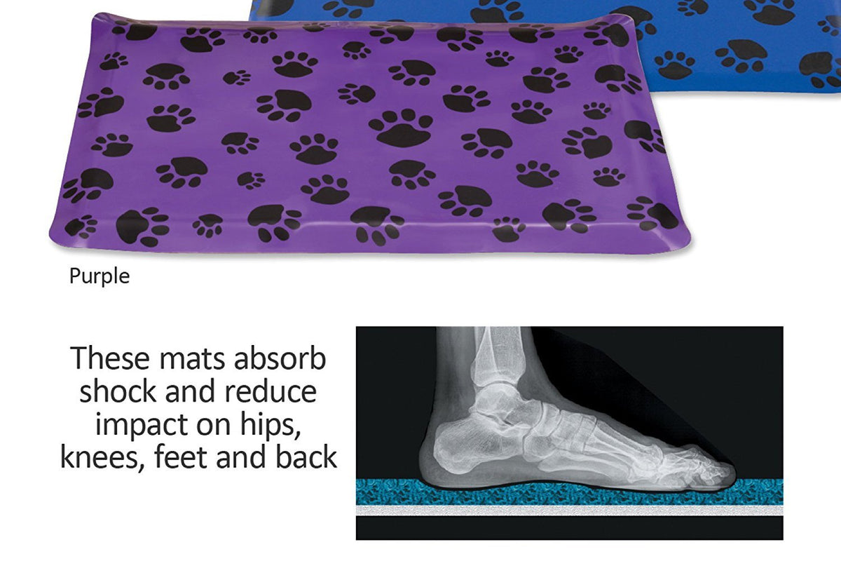 Groom all day with less back and neck pain! Thick foam and PVC Top Performance Anti-Fatigue Floor Mats help to absorb shock and reduce impact on hips, knees, feet and back. • Each mat has a small section of foam removed to accommodate the base of a hydraulic grooming table • Available in black, blue, pink and purple This product meets or exceeds Professional Pet Groomers and Stylists Alliance (PPGSA) standards.? Size: Each mat measures 36'L x 24'W Material: Heavy duty PVC and foam