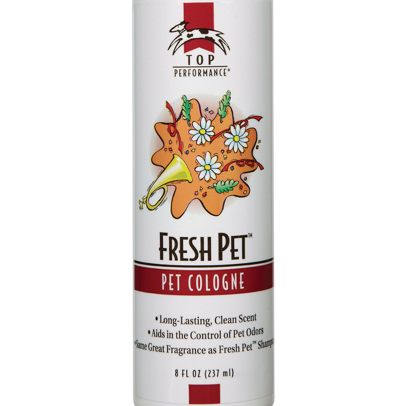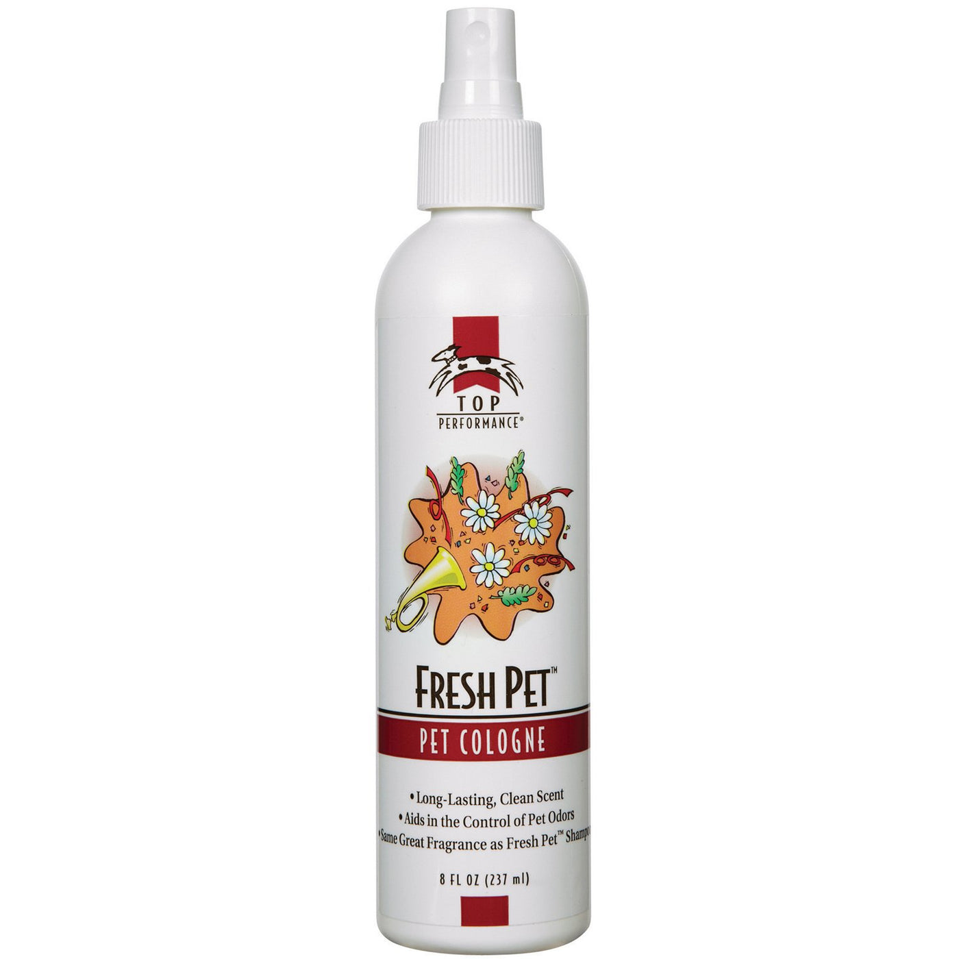 Top Performance Fresh Pet Cologne Mists gives coats a fresh clean scent that lasts for weeks and helps control pet odor between shampoos. Spritz on a pets coat as a finishing touch for just-groomed animals Perfect for at-home use Available in 8 oz pump spray bottlesSafe for dogs cats puppies and kittens over 6 weeks old.