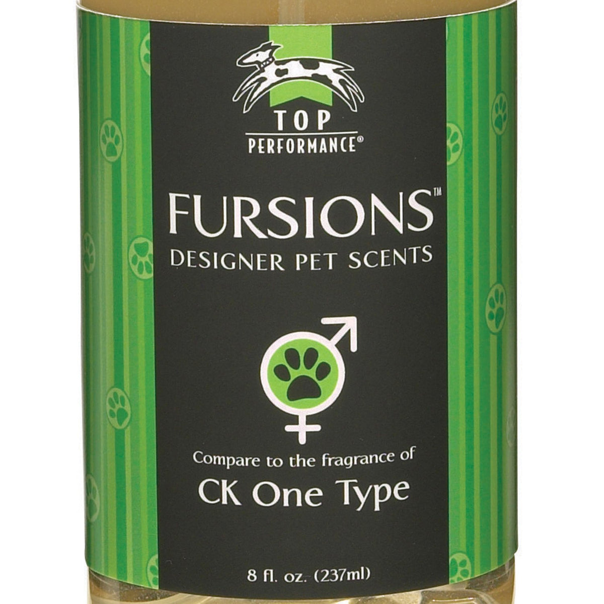 Q: What is the scent of the Top Performance Fursions Dog Cologne?A: The Top Performance Fursions Dog Cologne features a CK One scent, which is a unisex fragrance inspired by popular designer scents, making it a stylish choice for your dog.