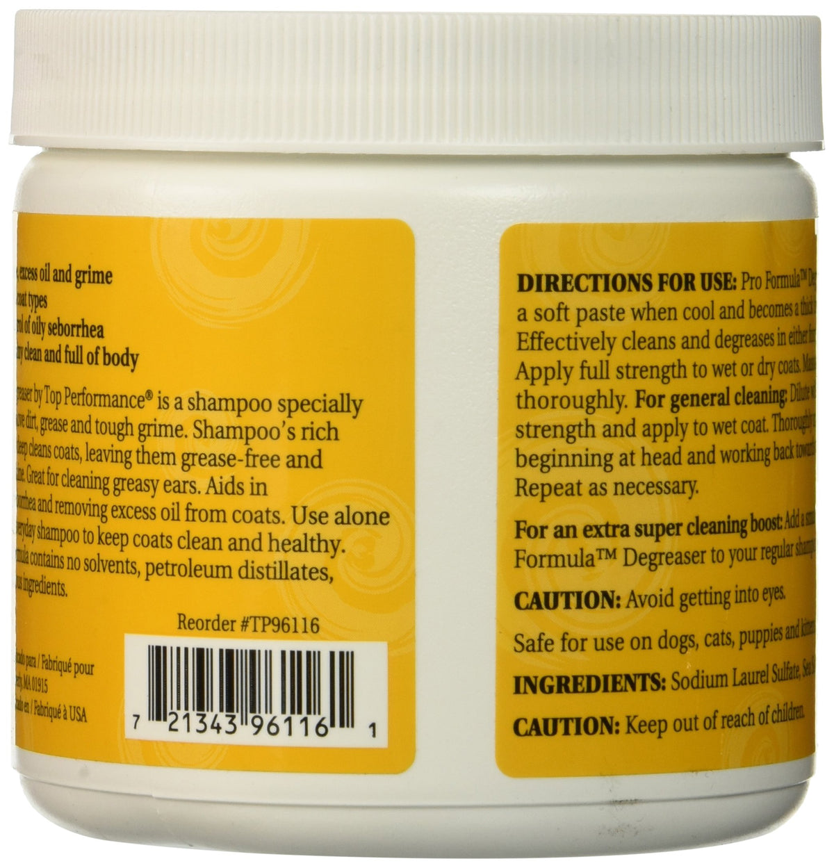 Top Performance Pro Formula Degreaser Specially Formulated To Tackle The Toughest, Hard-To-Remove Dirt, This Amazing Shampoo Deep Cleans Coats, Leaving Them Grease-Free And Full Of Body And Shine. Nothing Rids Coats Of Greasy Grime And Oily Residues Better Than Top Performance Pro Formula Degreaser. Use Alone Or In Addition To Everyday Shampoo To Keep Coats Ultra Clean And Healthy. Safe, Non-Toxic Formula Can Also Be Added To Any Shampoo To Give It A Super Cleaning Boost. Safe For Use On Dogs, Cats, Puppies, And Kittens Over 12 Weeks Old. Ingredients Are Sodium Laurel Sulfate, Sea Salt, Fragrance, And Color. Instruction: For Extra Problem Areas - Apply Full Strength To Wet Or Dry Coats. Massage Into Coat And Rinse Thoroughly. For General Cleaning: Dilute With Water To Desired Strength And Apply To Wet Coat. Thoroughly Massage Into Pet'S Coat Beginning At Head And Working Back Towards Tail. Rinse Completely. Repeat As Necessary. For An Extra Cleaning Boost - Add A Small Amount Of Pro Formula Degreaser To Your Regular Shampoo And Apply As Usual. Available In 16-Ounce. Measures 3-4/5-Inch Length By 3-1/2-Inch Width By 3-1/2-Inch Height.