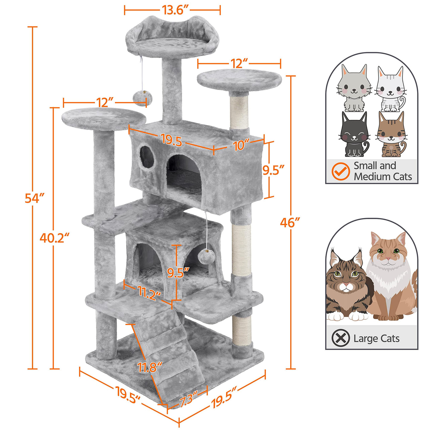Specifications:Color: Light Graymaterials: Particleboard, Plush, Sisal Assembled Dimensions: 48 Cm L 48 Cm W 137 Cm H / 19 L 19' W 54' Hbaseboard: 48 Cm L 48 Cm W / 19' L 19' W Big Condo: 48.5 Cm L 25 Cm W 24 Cm H / 19' L 10' W 9.4' Hsmall Condo: 28.5 Cm L 28.5 Cm W 24 Cm H / 11.2' L 11.2' W 9.4' Hround Platform Diameter: 30 Cm / 12'Ladder: 30 Cm L 18.5 Cm W / 12' L 7.3' W Maximum Weight Capacity: 20 Kg / 44 Lbitem Weight: 12.5 Kg / 27.5 Lbshipping Weight: 13.4 Kg / 29.5 Lb Note: 1. Please Allow A 2 Cm / 0.8' Measurement Tolerance.2. Keep Dry. 3. Keep Away From Fire And Other Heat Sources. 4. Keep Clean. 5. The Pet Species And Usage Scenarios Indicated In The Product Descriptions And Images Are For Reference Only. Please Order Products Based On Your Pet'S Characteristics And Needs.6. Use The Included Anti-Tip Kit To Secure The Cat Tree To The Wall For Safety.'