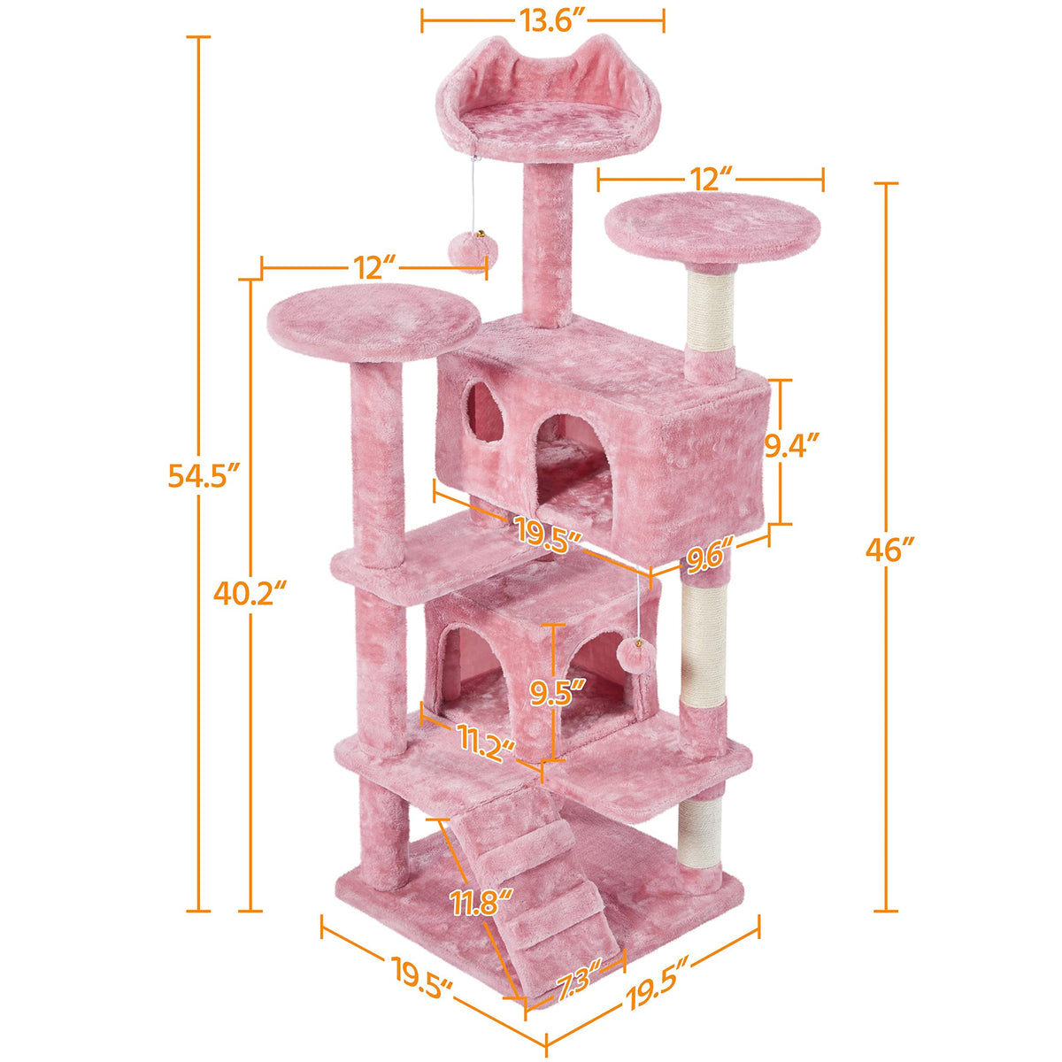 Specifications:Color: Pinkmaterials: Particleboard, Plush, Sisal Assembled Dimensions: 48 Cm L 48 Cm W 137 Cm H / 19 L 19' W 54' Hbaseboard: 48 Cm L 48 Cm W / 19' L 19' W Big Condo: 48.5 Cm L 25 Cm W 24 Cm H / 19' L 10' W 9.4' Hsmall Condo: 28.5 Cm L 28.5 Cm W 24 Cm H / 11.2' L 11.2' W 9.4' Hround Platform Diameter: 30 Cm / 12'Ladder: 30 Cm L 18.5 Cm W / 12' L 7.3' W Maximum Weight Capacity: 20 Kg / 44 Lbitem Weight: 12.5 Kg / 27.5 Lbshipping Weight: 13.4 Kg / 29.5 Lb Note: 1. Please Allow A 2 Cm / 0.8' Measurement Tolerance.2. Keep Dry. 3. Keep Away From Fire And Other Heat Sources. 4. Keep Clean. 5. The Pet Species And Usage Scenarios Indicated In The Product Descriptions And Images Are For Reference Only. Please Order Products Based On Your Pet'S Characteristics And Needs.6. Use The Included Anti-Tip Kit To Secure The Cat Tree To The Wall For Safety.'