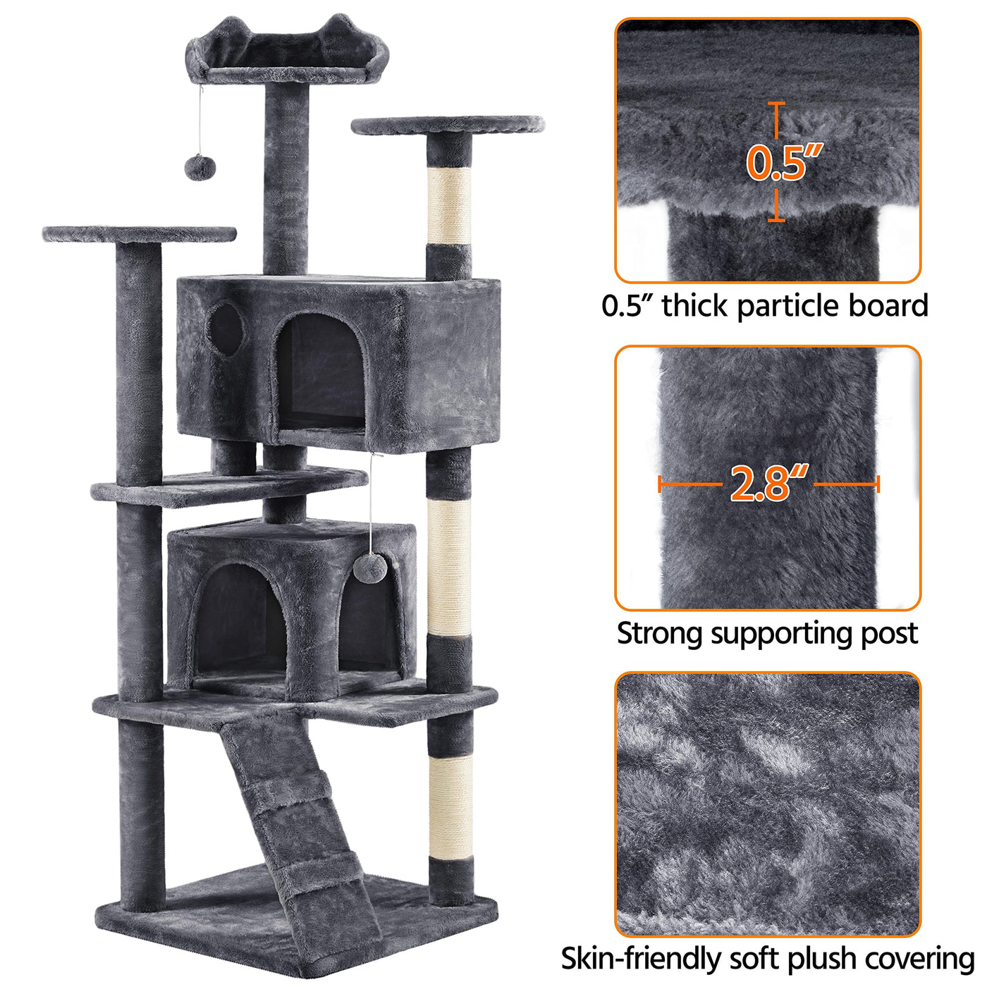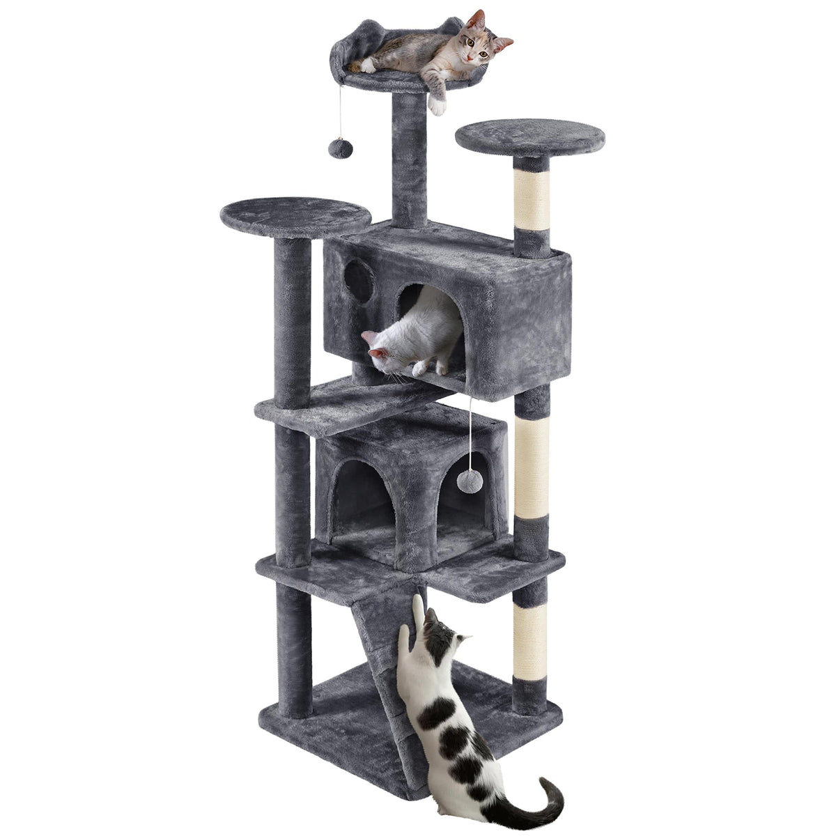 Cat Tree Kitten Tree Tower W/ 2 Condos &Amp; 2 Fur Balls &Amp; 3 Scratching Posts &Amp; 3 Platforms Multilevel Indoor Cat Tree Tower For Small Medium Catsquick Overview:Do You Know About Your Cat? What Is Your Cat'S Interest? Cats Are Active And Lively. They Need Suitable Places And Leisure Facilities To Have Fun. Our Multifunctional Cat Tree Will Meet Your Needs. This Multi-Level Cat Tower Is Loved For Its Spacious Cat Cave, Exciting Fur Balls, And Comfortable Top Perch And Condo For Relaxing After A Long Day Of Hide-And-Seek. The 3 Top Perches Bring Perfect Spots For Resting And Watching Outside, Two Condos For Hide-N-Seek, And Three Sisal Rope Scratching Posts For Developing Positive Scratching Behavior, And More Importantly, Freeing Your Furniture From Those Sharp Little Claws. Do Not Let Your Cat Wait Anymore!Specifications:Materials: Particleboard, Plush, Sisalcolor: Dark Grayoverall Dimensions: 55 Cm L 55 Cm W 178Cm H / 22 L 22 W 70 Hsmall Condo: 35 Cm L 35 Cm W 30.5 Cm H / 14 L 14 W 12 Hbig Condo: 55 Cm L 30.5 Cm W 30.5 Cm H / 21.7 L 12 W 12 Hdoor: 20 Cm W 22 Cm H / 8 W 8.7 Hround Platform Diameter: 34 Cm / 13.4Maximum Weight Capacity: 25 Kg / 55 Lbgross Weight (Product In The Box):19.4 Kg / 42.8 Lbnet Weight (Assembled Product Weight): 18.2 Kg / 40.2 Lbnote:1. Please Allow A 1.5 Cm / 0.6 Measurement Tolerance.2. Keep The Cat Tree Dry And Away From Fire.Package Included:1 X Cat Tree1 X Assembly Instructions1 X Accessory Kit