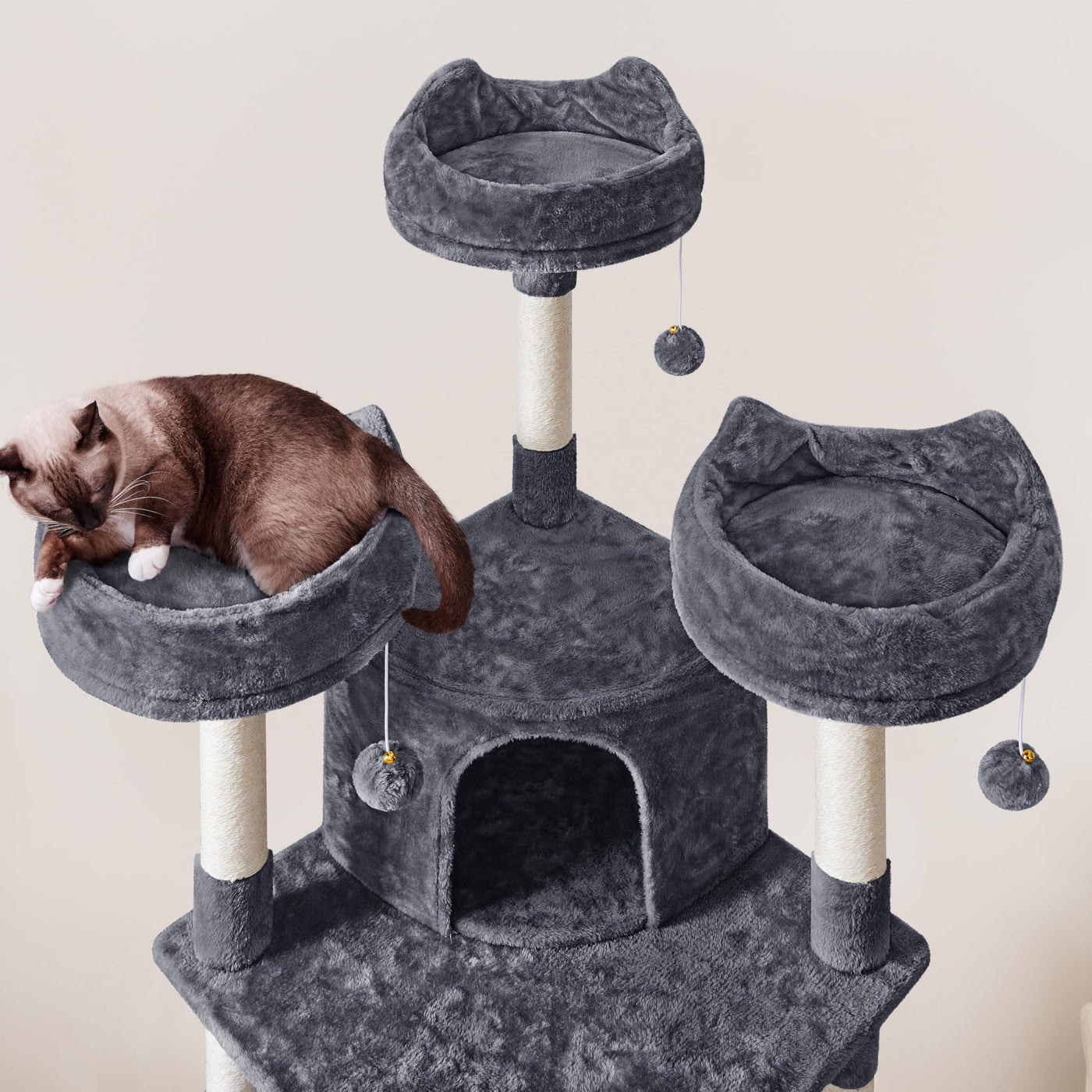 Q: Is the cat tree suitable for multiple cats?A: Yes, this cat tree is designed for more than one cat. It features three perched platforms, two fan-shaped condos, and ample scratching posts, making it suitable for two or three normal-sized cats or several kittens.
