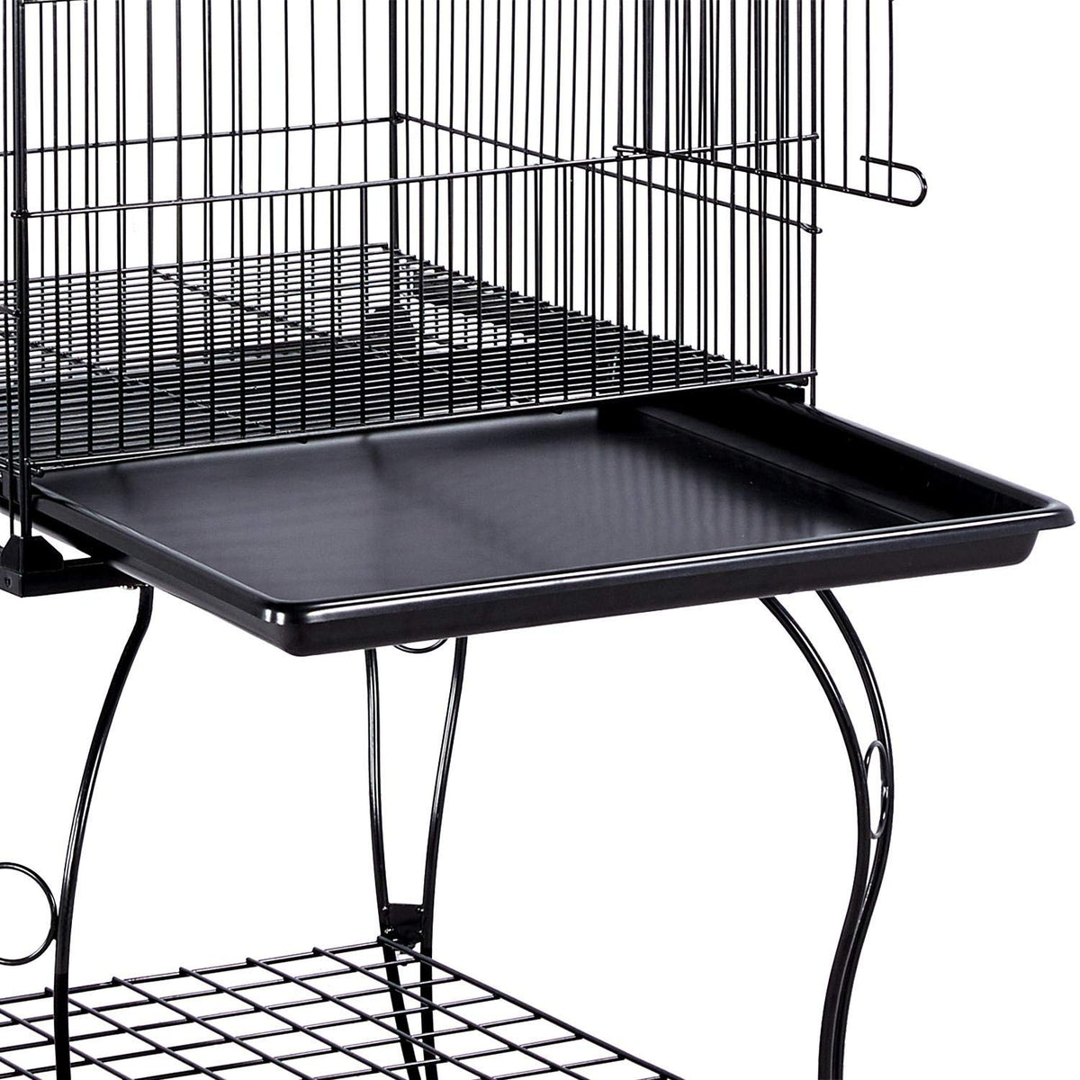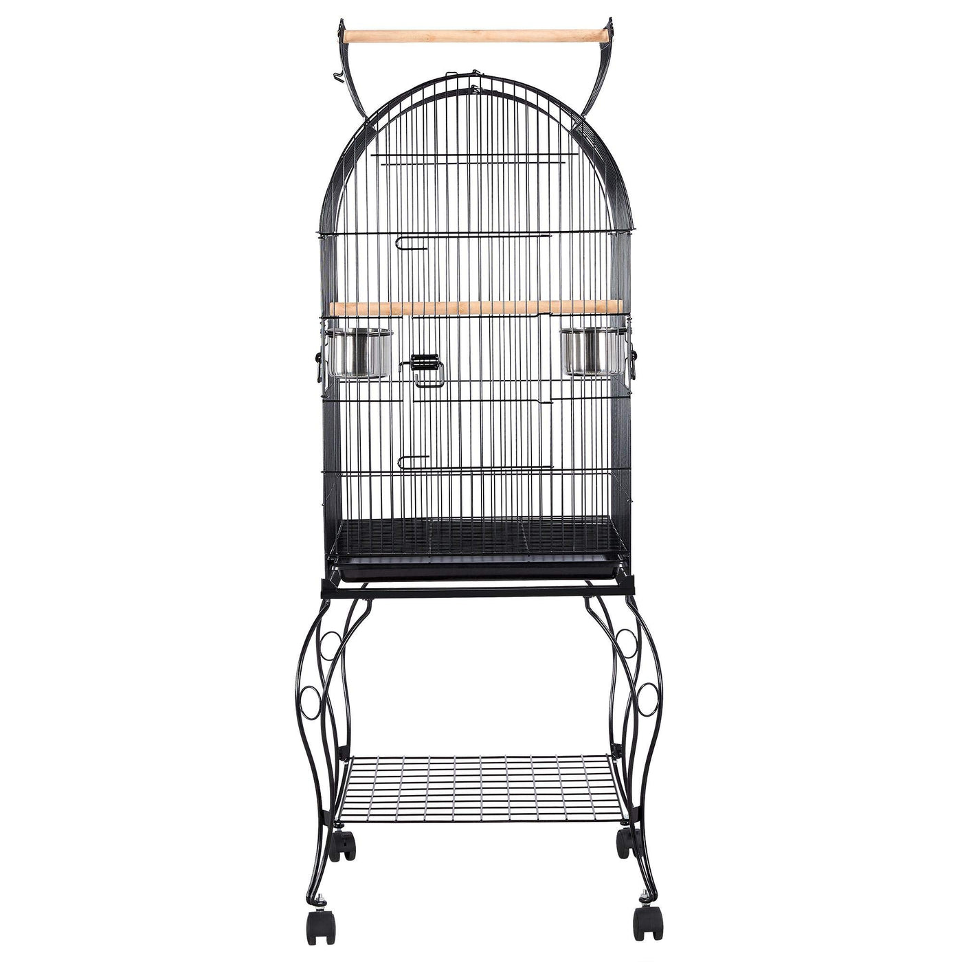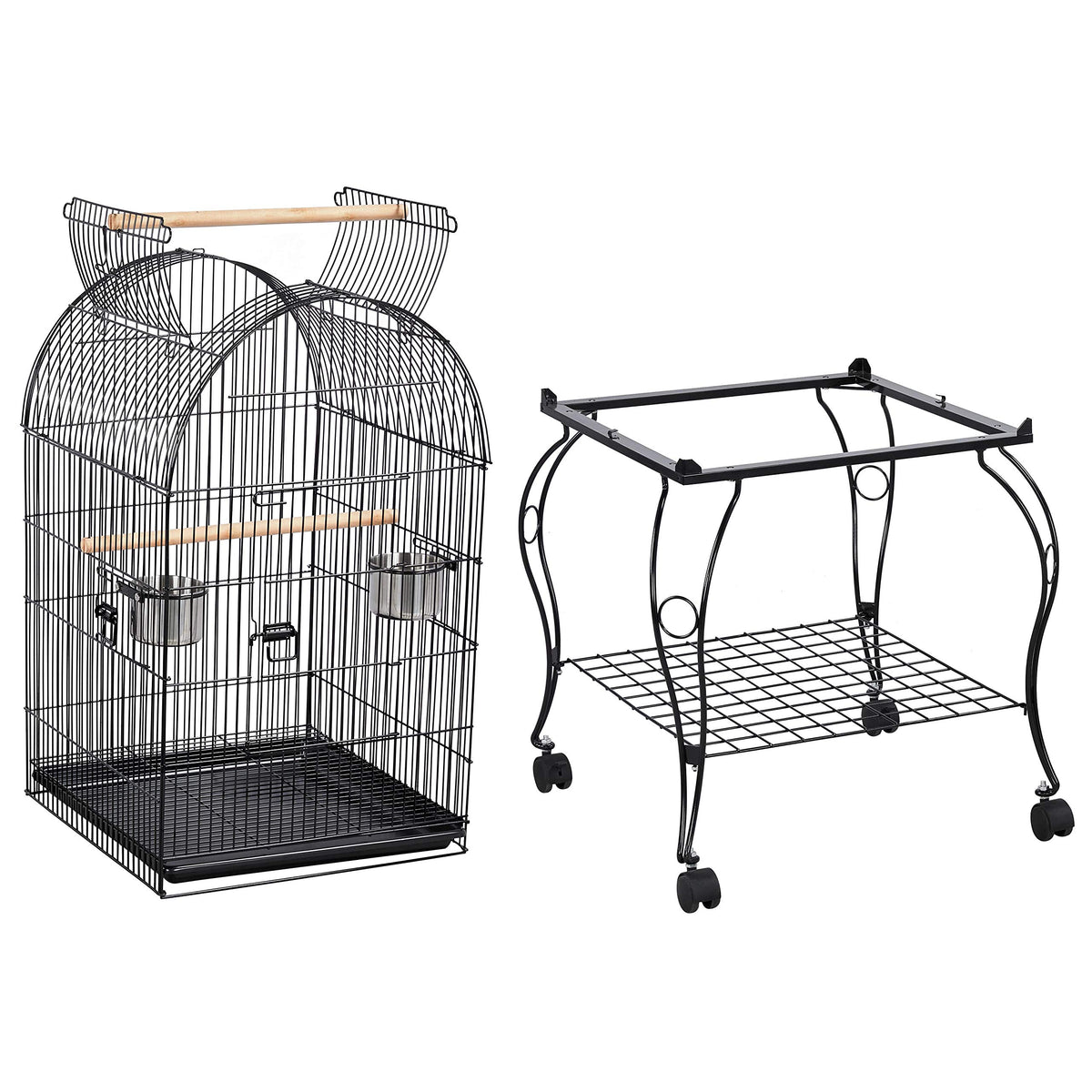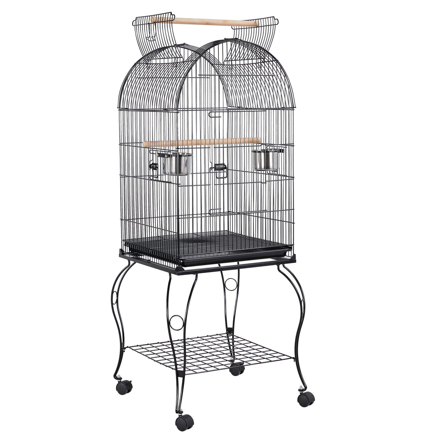 Specifications:Material: painted metal, PP plastic, ABS plastic, stainless steel, woodOverall dimension (with top open): 23.5x23.5x59inch (LxWxH)Cage size (with top closed): 20x20x32.7inch (LxWxH)Bar spacing: 0.6inchDoor size: 14.8x9.8inch (LxW)Rolling stand size: 23.5x23.5x22.4inch (LxWxH)Storage shelf size: 19.7x19.7inch (LxW)Free accessory: 2 stainless steel feeders, 2 wooden perchesG.W.: 26.9lbColor: blackNOTE:1. Please allow 0.3cm errors due to manual measurements.2. This cage is recommended for small birds. Please make sure whether this cage is suitable for your birds before placing an order.