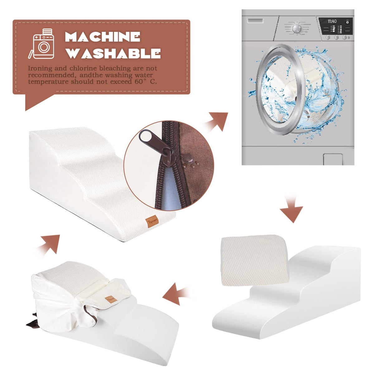 Product Size:Topmart Extended 3 Steps Dog Ramps&Staris is 15.7' High, 33.46' Long, and 15.7' Wide Package include: 3 Tier foam pet stair Machine washable soft cover (White) A pet hair remover roller Most pet stairs only consider how young and healthy pets can use them. They have not noticed how older and injured pets should use those hard and steep pet steps. Our Topmart dog steps are not only suitable for young and healthy pets,for older and injured pets, our pet steps is their best choice.