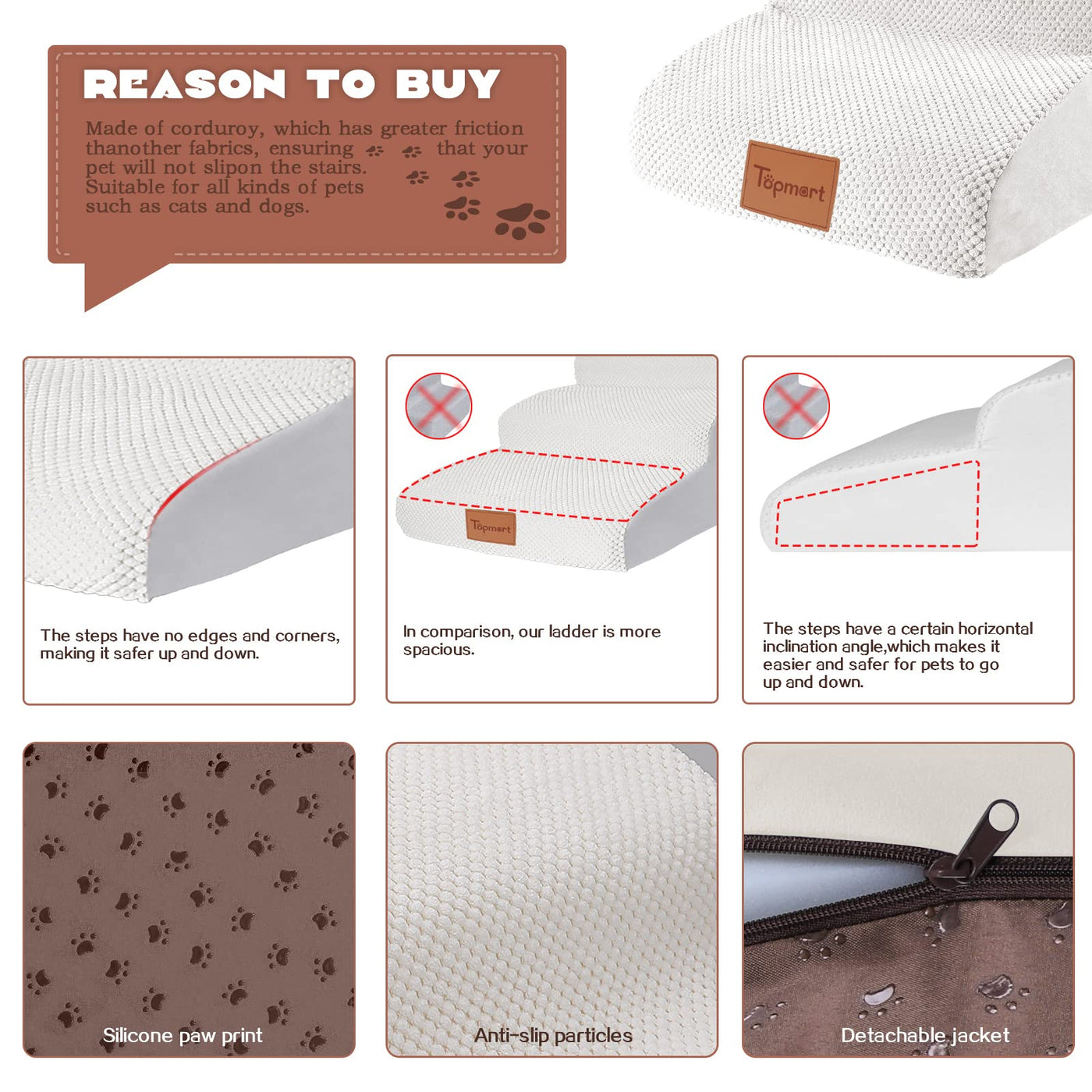 Q: What material is used in the Topmart dog stairs, and is it slip-resistant?A: The dog stairs are made of high-density foam covered with a corduroy fabric, which offers excellent slip resistance to ensure your pets' safety while using the ramp.