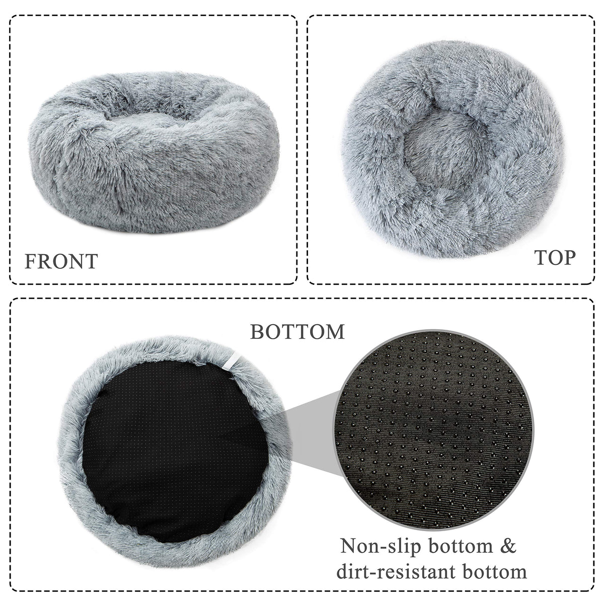 Peaceful Sleep] According to scientists the lengthy soft faux fur have the functions to pacify your pets which could create a safety and warming enviroment and simulate the perfect sleep cubic In this anti-anxiety donut dog bed your furry friend or bady would be calmed and relaxed whatever it is at room or outside Pls be not surpprised when you find how peaceful and cozy when your pet enjoyed its bed It is deserved for your pet Superb comfortablility] The Anti-Anxiety donut dog bed is designed for your pets comfortability The round shape is to create a larger space and convenient for your ped to rest the thick bottom provides the comfortable and warming cushion and the raised rim gives the support for your pets head and neck and the securiy as be surrounded At last the soft flaux fur will let your bark buddy sink in it and take the immersive sleeping High-Quality Materials] The exterior materials of calming donut dog bed are durable luxurious dense and lengthy faux fur which is fine texture soft not wool not ball dont rub off The interior is filled with super-soft friendly PP cotton It is light-weight and portable for travel The Anti-skid bottom is dustproof and convient to place Easy Maintenance] For maintance the cuddler dog bed is easy to clean and wash For better behavior hand wash is recommended also it is machine washable Pls gentill cycle tumble dry with low heat during the washing Multi-variant] Our plush donut dog beds have 7 colors and 4 sizes variants The colors are Brown Dark-grey grey Pink Purple and Silver You can select it according to your preferences or living enviorment For 4 sizes diameter 20 inch is suggested for dogs or cats up to 12lbs diameter 24 inch for up to 25lbs diameter 28 inch for up to 35lbs and diameter 32 inch for up to 45lbs