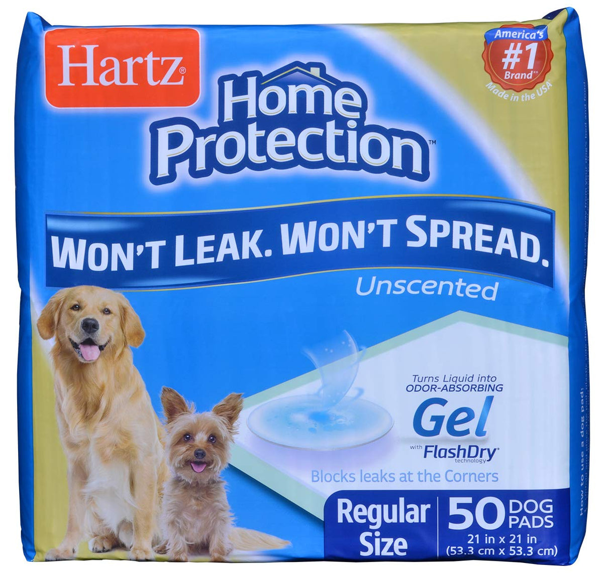 Wont Spread. Wont Leak. Hartz Home Protection Dog Pads have Flash-Dry Technology which instantly turns urine into gel. They also contain a built-in attractant. 50 or 80 Pads (21in x 21in). This is an offering for multi quantity bundle - 4 count