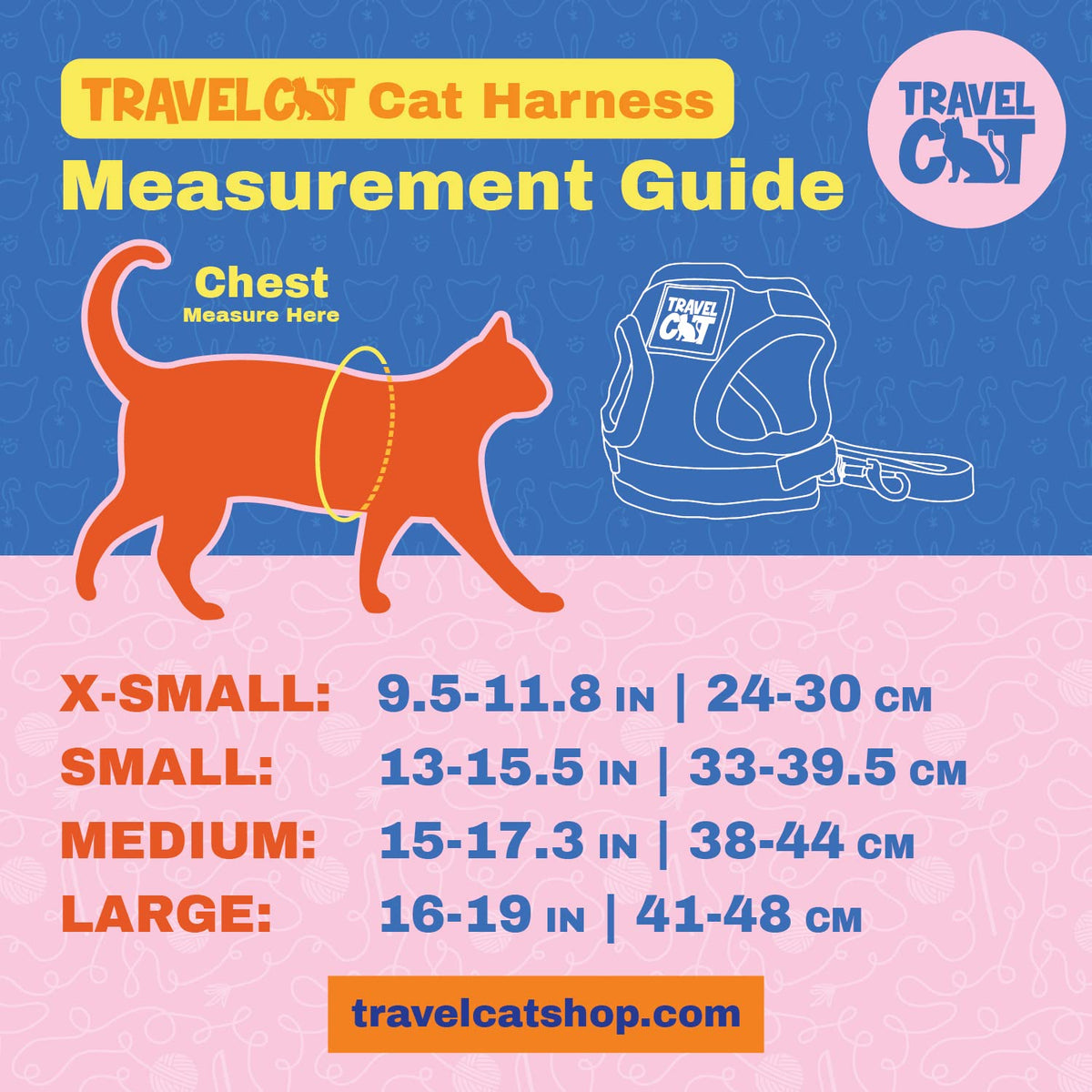 Q: What sizes are available for the Travel Cat Harness and Leash Set?A: The Travel Cat Harness and Leash Set is available in four sizes: extra small, small, medium, and large. To find the best fit, measure your cat's chest snugly and refer to the size chart. If your cat is between sizes, choose the larger size if they are still growing.