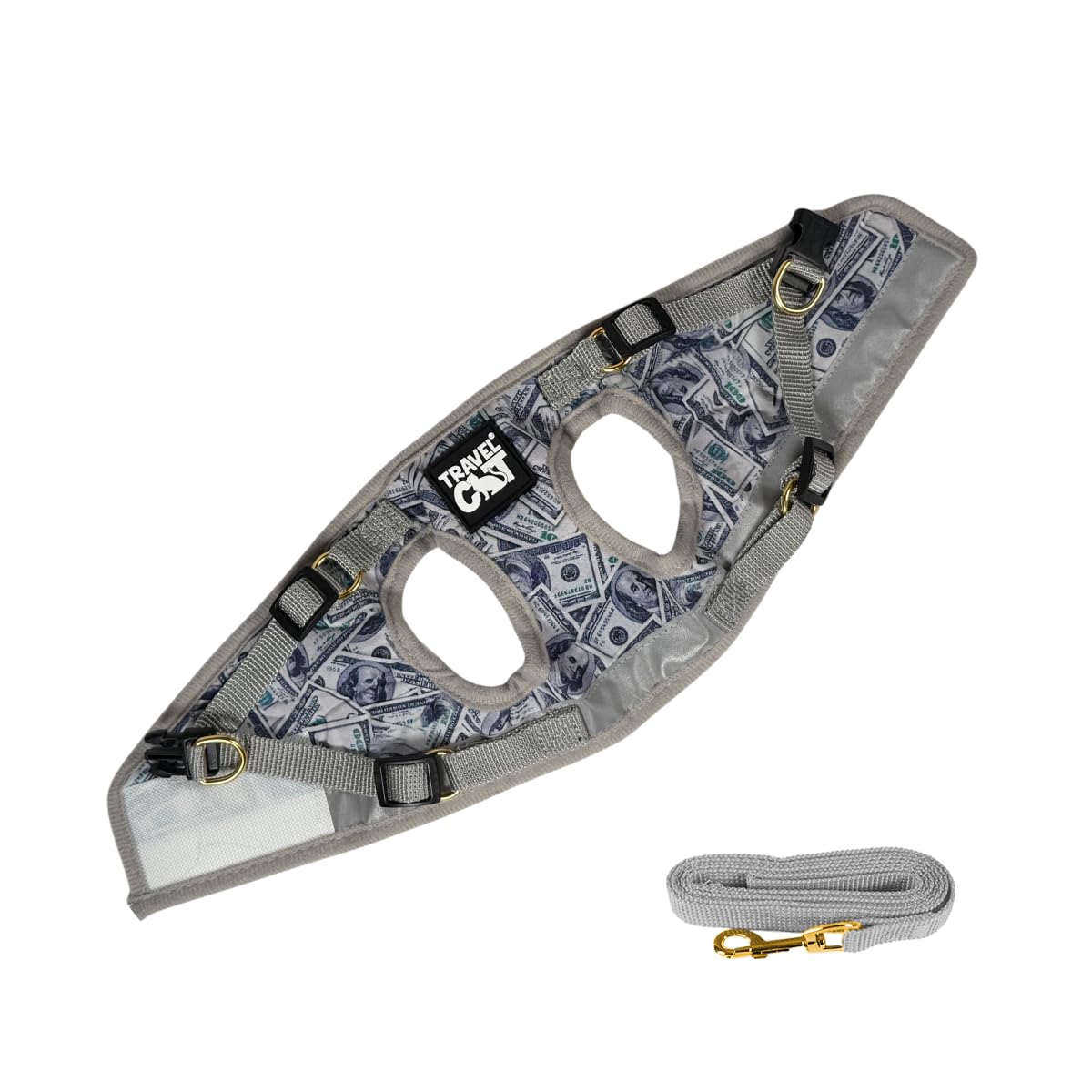 Q: What materials are used in this harness and leash set?A: The Travel Cat & Stray Cat Harness and Leash Set is made from soft, breathable cotton material for comfort, with durable nylon for the leash. The harness also features a sturdy metal alloy snap clip for secure attachment.