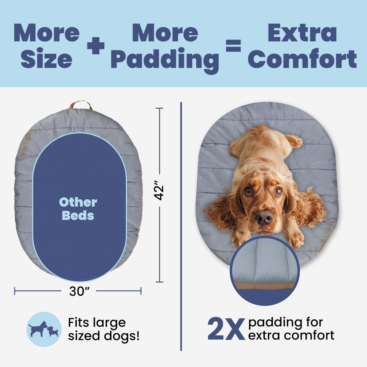 Wherever your adventures take you, ensure your furry friend has a comfortable place to rest with this Travel Dog Bed. Designed for pet owners who love to explore, this lightweight, portable, and easy-to-clean dog mat makes every trip with your pup more enjoyable. Ultimate Comfort for Your Dog, Anywhere No more cold, hard, or uneven surfaces! Our extra-padded design creates a soft and supportive sleeping spot, helping your dog relax after a long hike, road trip, or outdoor adventure. Unlike thin travel mats, this bed offers more loft and cushioning, ensuring your pup feels at home no matter where they rest. Less Mess, Less Stress - Stays Clean & Odor-Free Say goodbye to dirty, smelly dog beds! This water resistant and fur-resistant mat keeps dirt, spills, and odors at bay, so your pup stays fresh and comfortable. Whether its muddy paws or unexpected spills, simply wipe clean or toss it in the washing machine for easy maintenance. Travel Light Without Sacrificing Comfort Your dog deserves a comfortable place to rest on the go, but you dont need to pack bulky beds! This roll-up dog bed compresses into a compact size and fits neatly into its included carry bag, making it perfect for hiking, camping, road trips, and more. Built for Durability - Holds Up to Every Adventure Unlike flimsy travel mats, this sturdy, ripstop nylon dog bed is tear-resistant, water-resistant, and reinforced with strong stitching. Designed to withstand frequent use, its made to last through years of outdoor fun while keeping your pup comfortable. Designed for Versatility & Everyday Use Use this multi-purpose mat as a crate pad, car seat cover, tent mat, or outdoor dog bed. Its insulated design protects your dog from hot pavement, cold ground, or rough terrain, ensuring comfort in all seasons. Why Pet Owners Love This Travel Dog Bed -More cushioning than other travel beds for superior comfort -Dirt, fur, and odor-resistant fabric for easy maintenance -Fits inside standard crates, kennels & carriers -Non-slip bottom prevents sliding on smooth surfaces -Lightweight & compact - Perfect for traveling pet owners No matter where you and your dog go, this portable travel bed ensures your pup always has a comfortable, clean, and reliable place to rest. Order now and give your dog the comfort they deserve on every adventure!