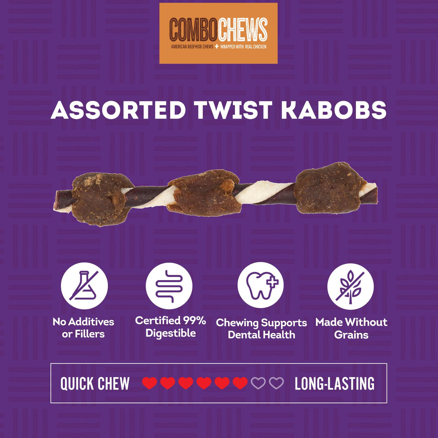 Introducing Treatly Combo Chews, the ultimate chewing experience for your beloved pup, crafted with care and packed with flavor! These combo chews arent just treats; theyre a heartfelt expression of gratitude, because a treat is how you tell your pup Thank you for loving me, I love you too! Made from high-quality rawhide or beefhide, these chews offer a tough and durable texture, perfect for aggressive chewers of all sizes, from small to giant breeds. With a combination of sticks, kabobs, twist sticks and more, each chew provides long-lasting enjoyment, promoting dental health by reducing plaque and tartar buildup. In our convenient pouch or bag, youll find a variety of flavors, including pork and chicken, to keep your pup entertained and satisfied. Treatly Combo Chews are unprocessed and of the highest quality, ensuring a safe and enjoyable chewing experience for your furry friend. Give your pup the gift of flavor and fun with Treatly Combo Chews, because a treat is how you tell your pup Thank you for loving me, I love you too!